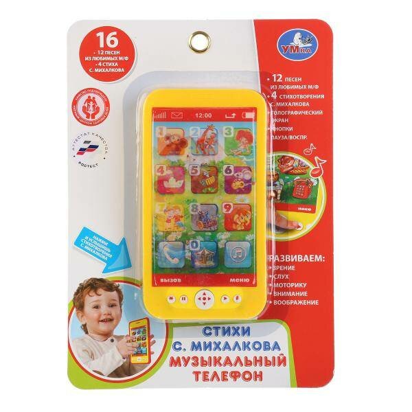 Умка Музыкальный телефон со стихами С. Михалкова ТМ УМка станет прекрасным подарком для ребёнка. 4 стихотворения С. Михалкова 12 песен из м/ф. Голографический экран. Кнопки Пауза/Воспр. Вашего малыша приведёт в восторг эта игрушка в виде яркого телефона. Ребёнок с удовольствием будет нажимать на кнопки, слушать замечательные стихотворения Сергея Михалкова и весёлые песни из мультфильмов. Эту компактную игрушку удобно повсюду брать с собой. Музыкальная игрушка ТМ УМка развивает: Мелкую моторику. Внимание. Память. Музыкальный слух. Зрение. Воображение. Размер: 15х8х1 см. Размер упаковки: 24х18х2 см. Материал: пластмасса. Работает от 2-х батареек типа АА в комплекте. Рекомендовано детям от 1 года.