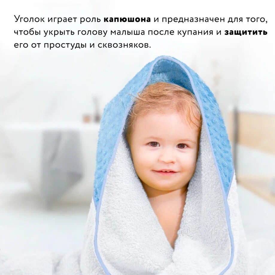 Уголок (капюшон): нижний слой (соприкосновение с головой малыша) - ткань махровая (100% хлопок); верхний слой - 100 % РЕ ткань вельбоа.