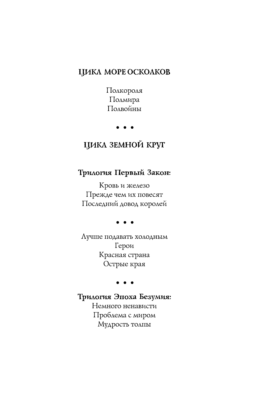 И вновь Джо Аберкромби радует своего читателя новой трилогией и историей. Новая трилогия имеет название половинчатая трилогия (по размеру книг они действительно смахивают лишь на половину книги). Новые персонажи, новые истории, всё это ждёт читателя в этой книге. Писательское мастерство Аберкромби всё также на высоте, местами немного затянутые главы, но в общем и целом читается легко.