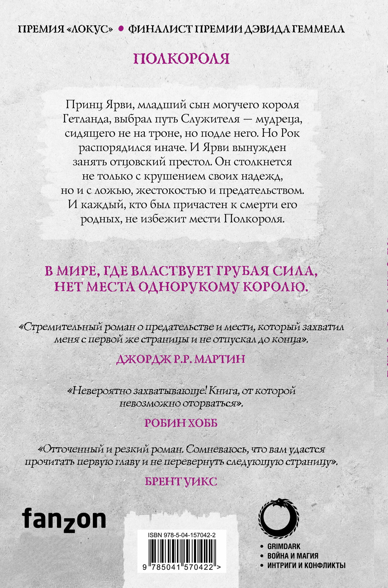 Итог: занятный роман на 1-2 вечера, очень похож на творение Лоуренса, но несколько отличен от него. И я уверен, что «Полукороль» только открывает общее повествования про Ярви, всё еще будет впереди. Ждем продолжения! Благо финал «Полукороля» вышел многообещающим -