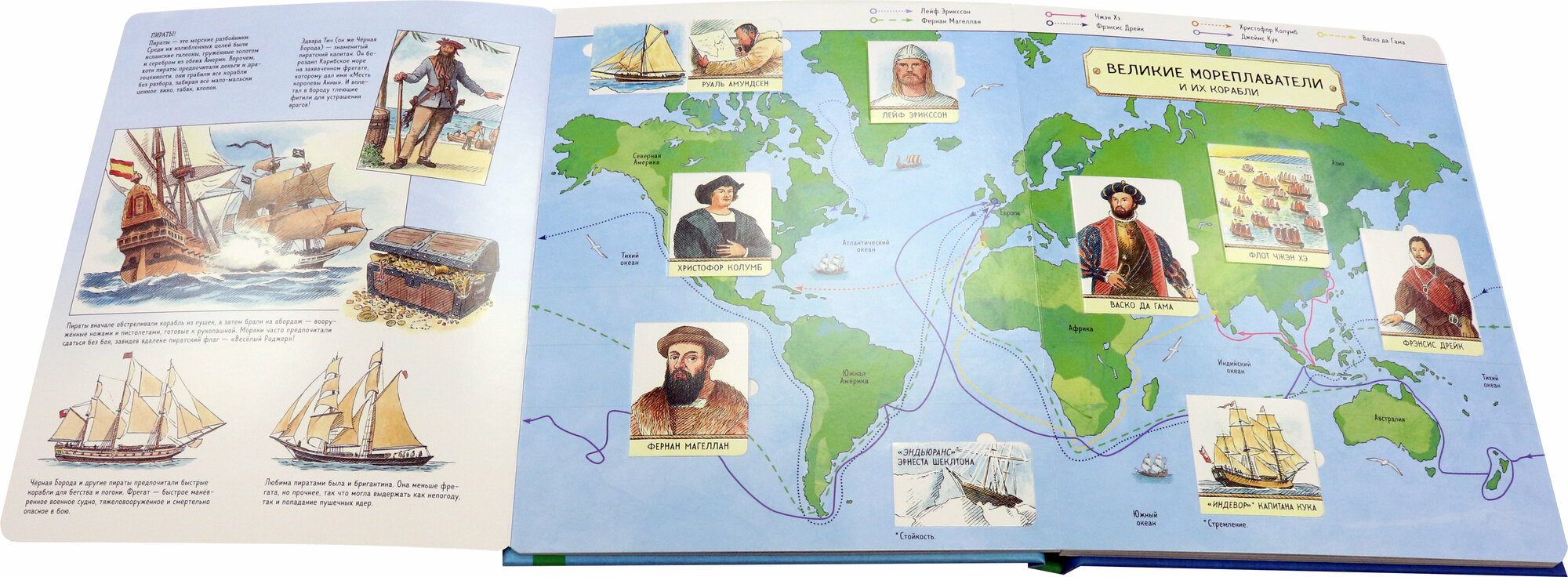 Теперь о содержании. Книга знакомит нас с историей развития кораблестроения, парусными судами, пароходами и подводными лодками, даже знаменитому Титанику уделили целый разворот. Мальчикам будет особенно интересна информация про морские сражения. Имеется большой разворот карты мира с маршрутами великих мореплавателей (Васко Да Гама, Фрэнсис Дрейк, Чжэн Хэ, Христофор Колумб, Фернан Магеллан и многие другие). Не забыли упомянуть и о пользе и работе кораблей в современном мире (пожарные суда, спасательные, грузовые, ледоколы).