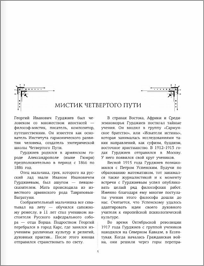 Эта книга, конечно, предназначена в первую очередь для любителей всякой эзотерики, поскольку Гурджиев - классик этого направления знаний/исканий/практик. Но и те, кому вся эта эзотерика малоинтересна, смогут найти много интересного о жизни столетие назад: всё течет, но не всё меняется. Полиграфически книга издана очень хорошо, как подарочное издание.