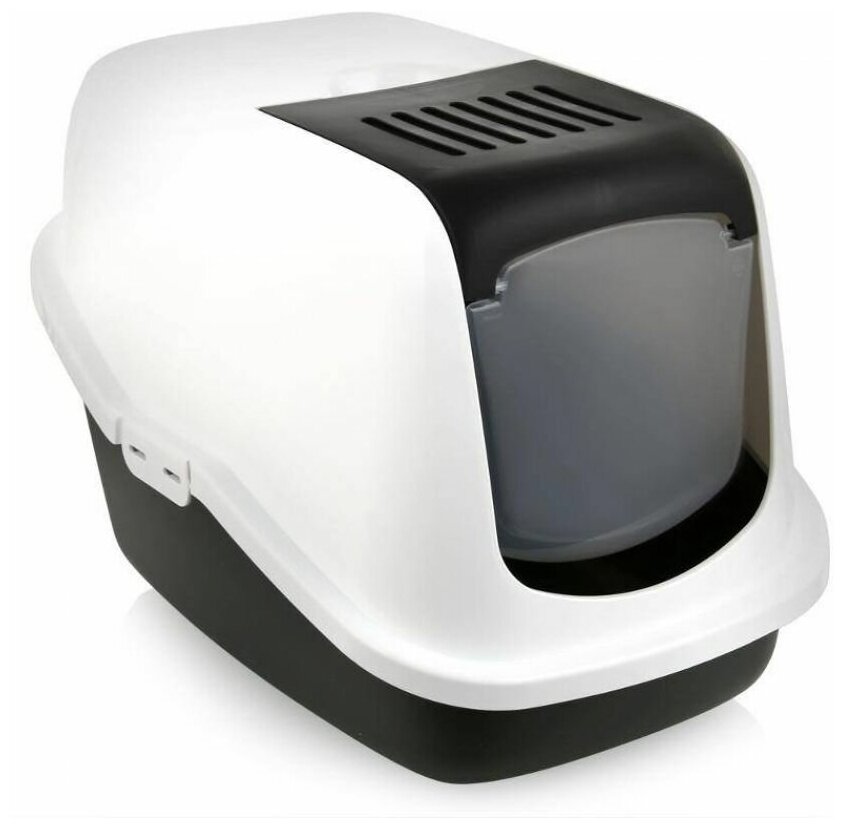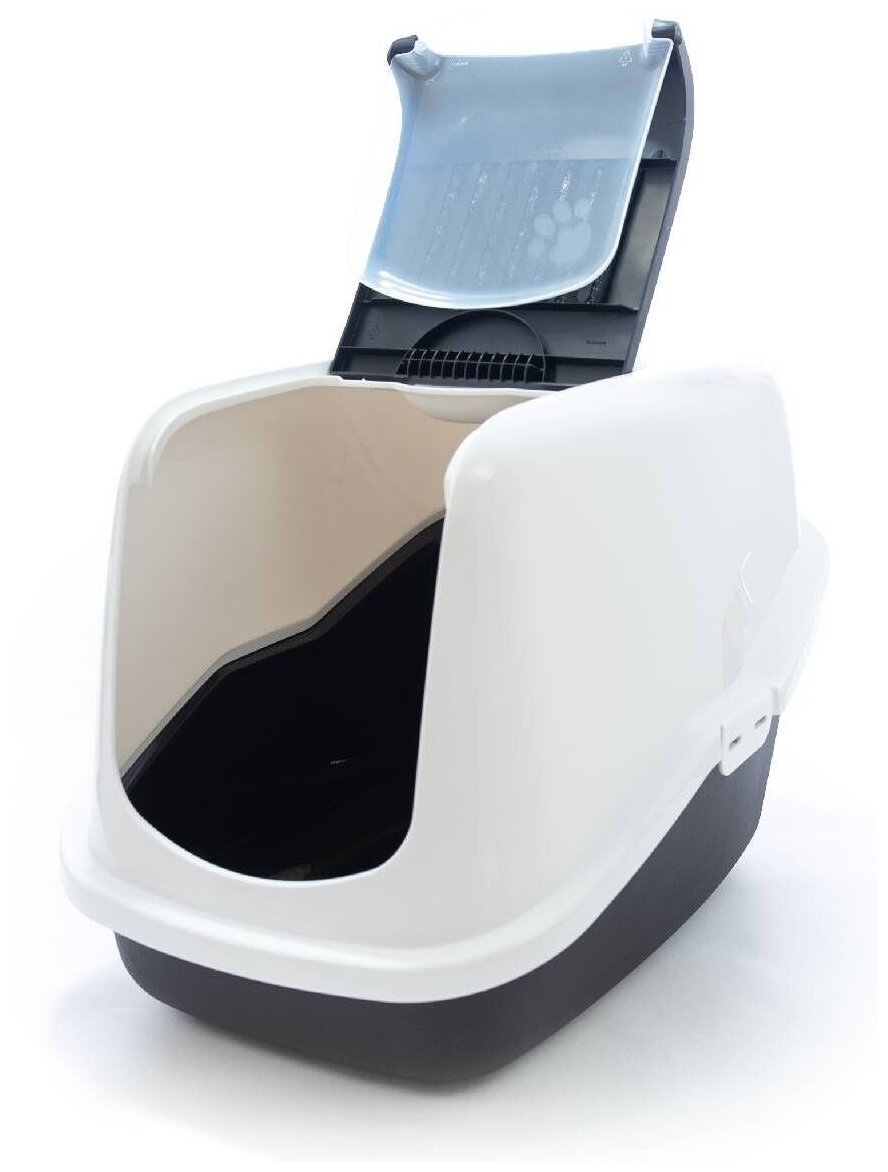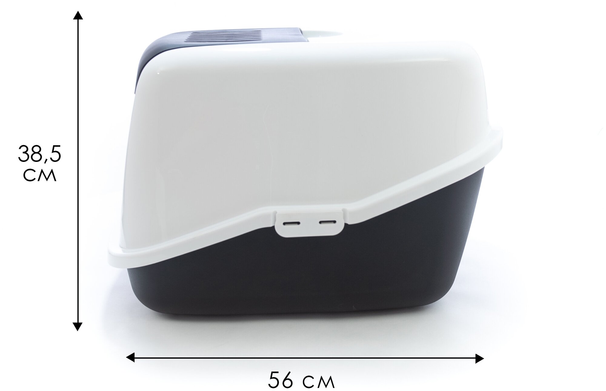 премиум классас закрытой дверцейпластиковый. Туалет оснащён ячейкой для сменного фильтра. Закрытые кошачьи лотки пользуются большим спросом, так как выглядят более эстетично, чем открытые, спасают от
