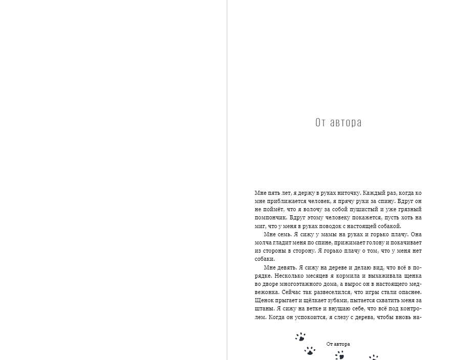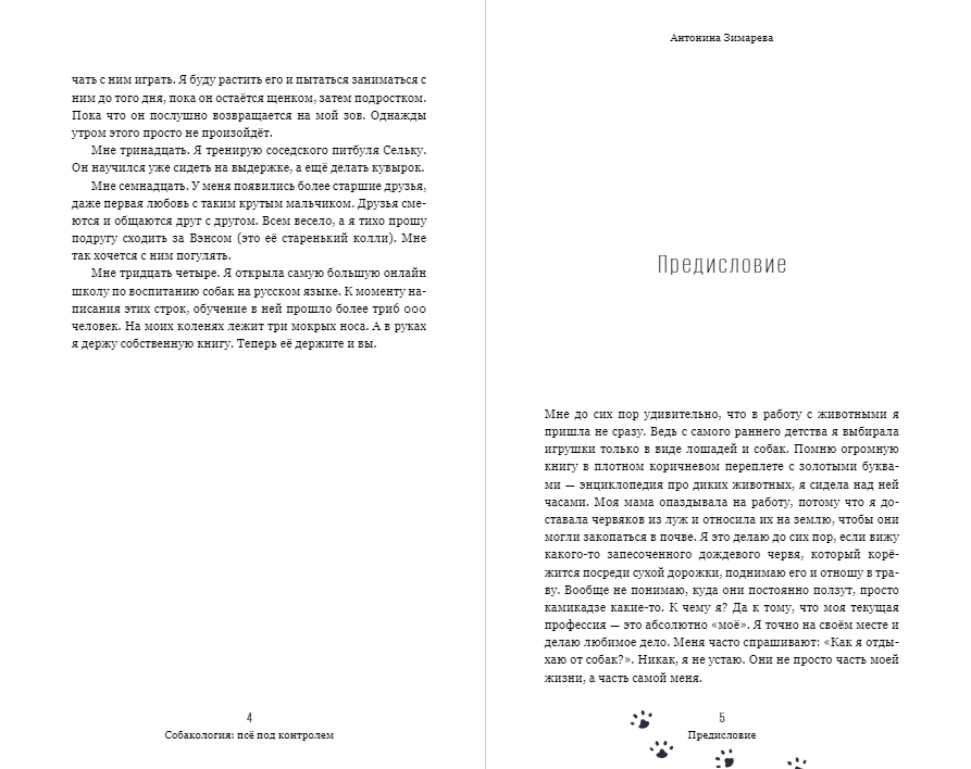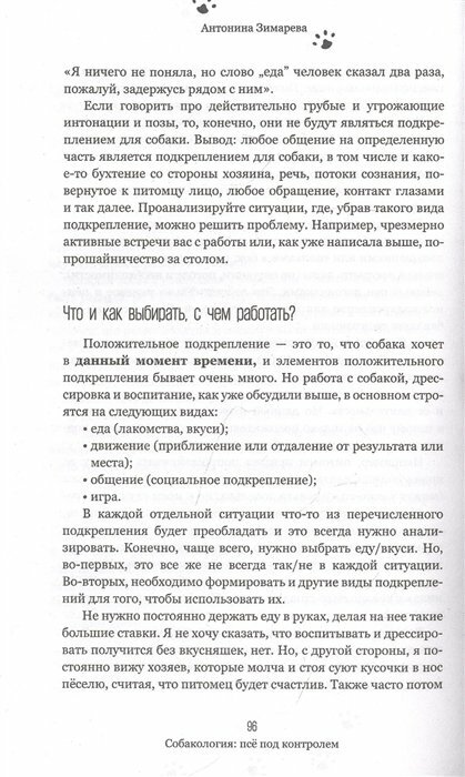 Единственный минус(ну это даже не минус, просто очень сильно бросалось в глаза до середины книги, потом привыкла), текст написано немного суховато и серьезно, именно поэтому слова "вкусинка,вкуся,псюша" прям даже немного раздражали. Но это мелочи. По названию думала, что книга будет о психологии собак, а тут прям целое тренировочное пособие! возможно, если вы совсем раньше не занимались, то будет немного сложновато где-то, все таки без демонстрации, только на словах все упражнения. но я считаю там прям целый кладезь полезных тренировок и навыков. и все же параллельно рекомендую почитать книги о психологии животных, это тоже важно!