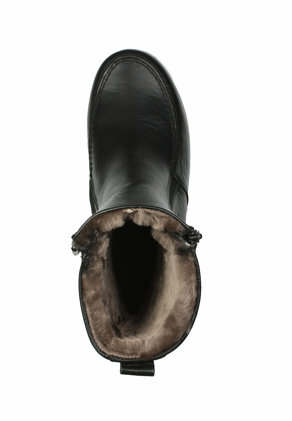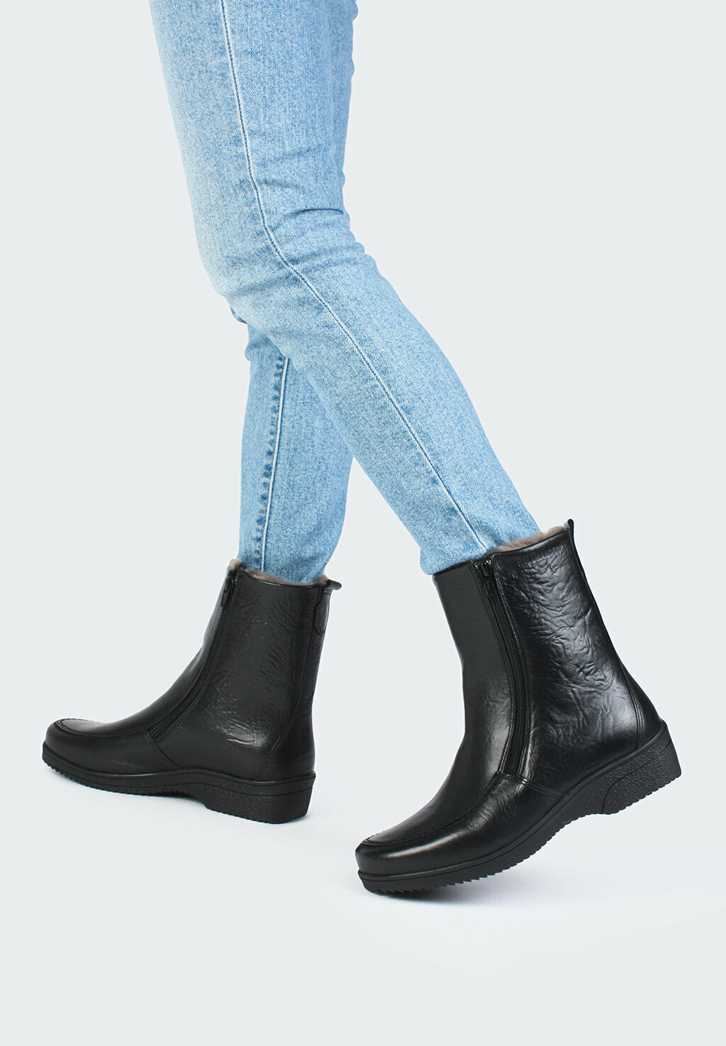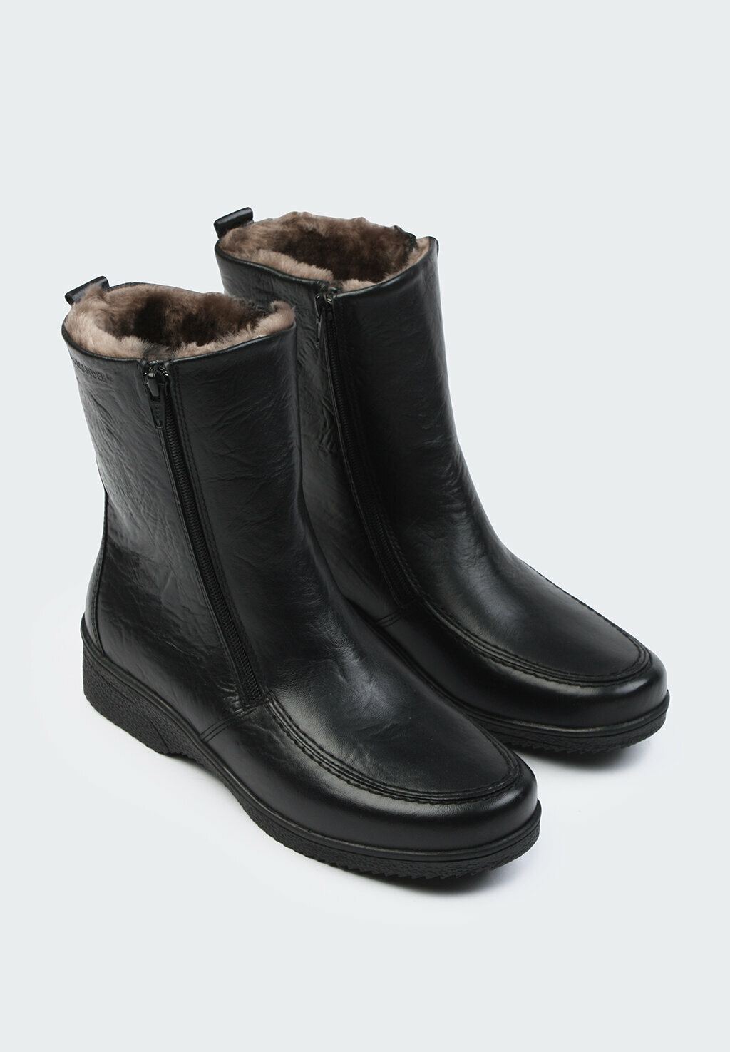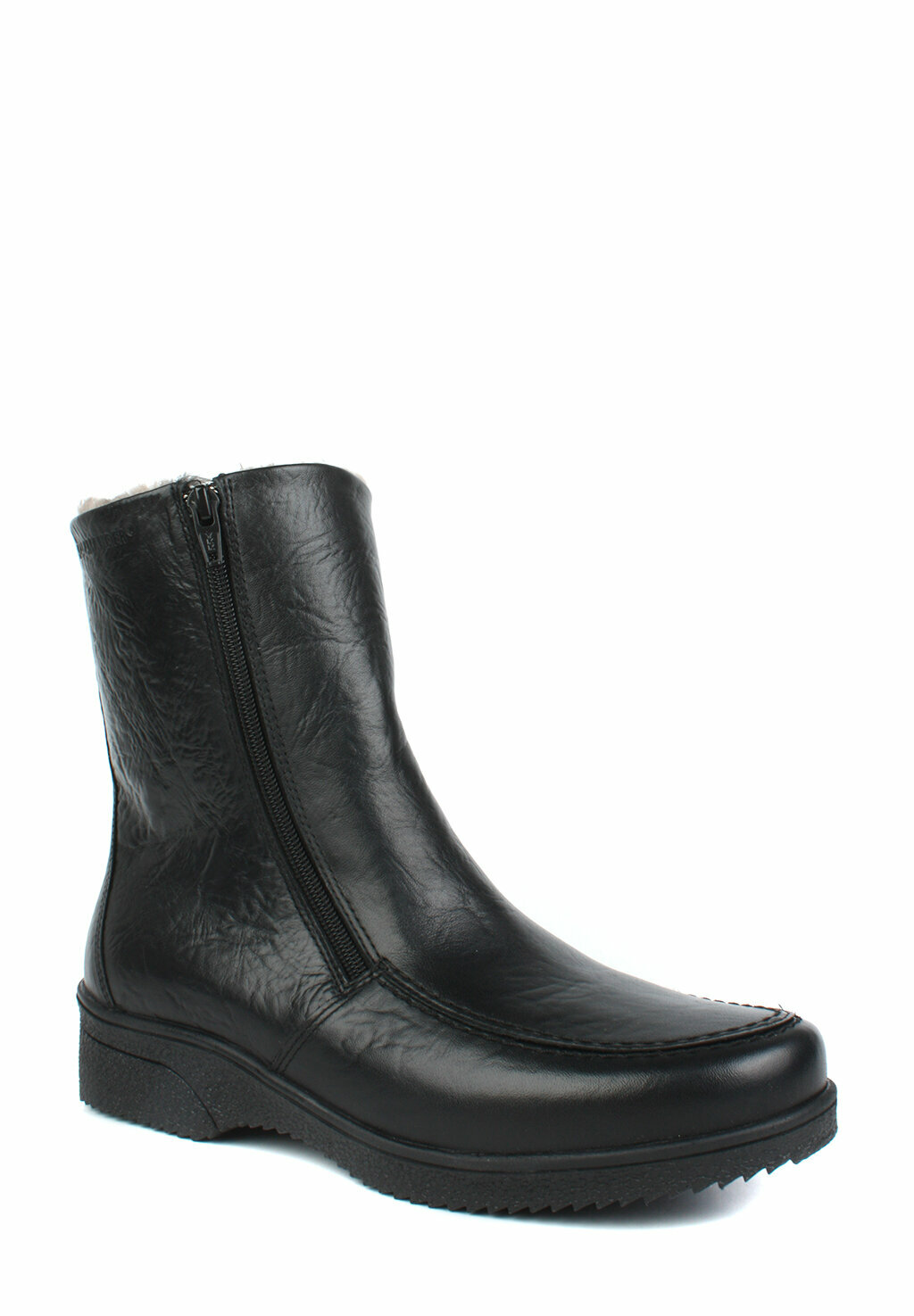 Аккуратные и практичные зимние полусапожки с двумя молниями для активных девушек. Обувь полностью из натуральных материалов: верх – кожа, утеплитель – мех. Подошва из ТЭП не скользит. Пара сделана без декоративных элементов, выдержана в черном цвете, а потому сочетается почти с любой одеждой, в том числе строгого фасона.