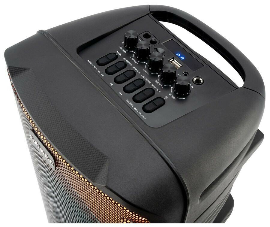 Акустическая мини-система Sunwind поднимет градус любой вечеринки. Чистая передача звука, глубокие басы, несколько вариантов подсветки и автономная работа — лишь часть возможностей модели. В ее функционал входит: воспроизведение музыки с различных источников;работа в качестве системы караоке и радиоприемника;создание дополнительных звуковых эффектов;работа в режиме панорамного стерео. Источники музыки Большую коллекцию музыки можно записать на USB-накопители и карты формата MicroSD объемом до 32 Гб. По беспроводному соединению колонка подключается к гаджетам с помощью Bluetooth 5.0. Проводное подключение к телевизору через AUX-вход даст возможность смотреть фильмы и концерты с эффектом нахождения в кинотеатре. Караоке и дополнительные возможности системы Комплектация модели микрофоном позволяет начать петь караоке в любой момент. Отдельная настройка громкости микрофона и функция Mic Priority позволяют петь в самых разных вариантах: соло, дуэтом с исполнителем или просто подпевать ему. В колонке также доступны звуковые эффекты. Громче и объемнее Технология беспроводного подключения TWS позволит синхронизировать две колонки и получить эффект панорамного стерео. Для управления вечеринкой с танцплощадки используйте пульт ДУ или воспользуйтесь кнопками на колонке. На мини-системе предусмотрена возможность отдельной регулировки высоких и низких частот, а также функция эквалайзера с несколькими предустановленными режимами.