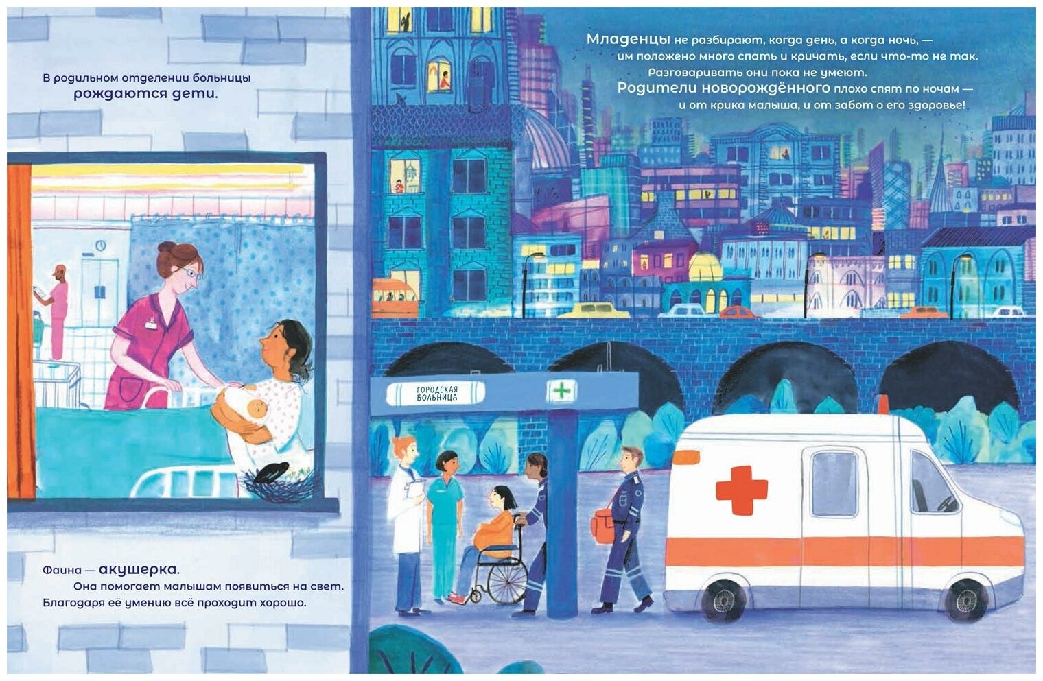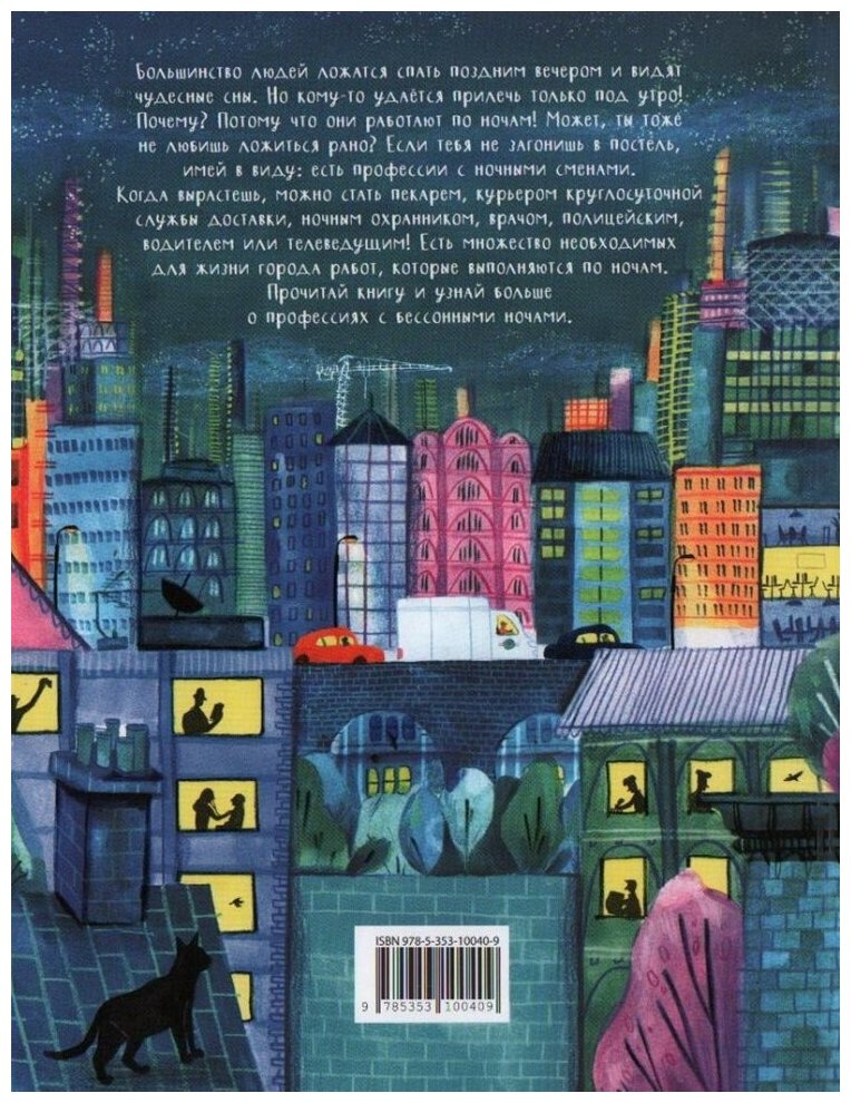 Невероятно красочная и яркая книга для самых маленьких читателей познакомит с профессиями, которые каждую ночь готовят город к новому дню: врачи, водители, строители, полицейские, пекари, курьеры и продавцы. Прекрасные детализированные иллюстрации увлекут ребенка надолго.