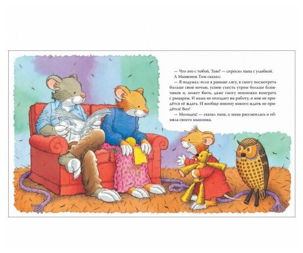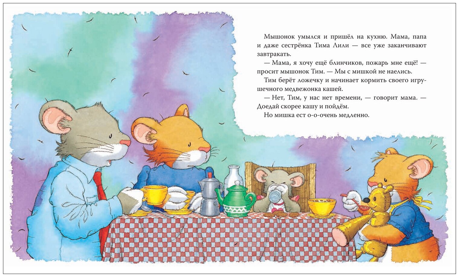Скупили уже практически все книги про мышонка Тима. Сыну 3,5 года, и это самая любимая его серия книг. Готов слушать истории про Тима, а потом смотреть картинки, каждый день. Именно эта книга учит, что опаздывать не хорошо, что нужно раньше ложиться, чтобы поспать подольше)) Добрая, красочная, со смыслом. Рекомендую для деток 2-4 лет