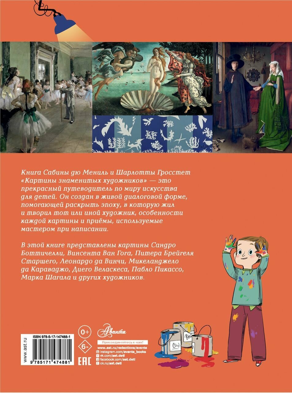 Книга Сабины дю Мениль и Шарлотты Гросстет «Картины знаменитых художников» — это прекрасный путеводитель по миру искусства для детей. Он создан в живой диалоговой форме, помогающей раскрыть эпоху, в которую жил и творил тот или иной художник, и особенности каждой картины. Этот путеводитель увлекательно и просто расскажет о судьбах художников и их знаменитых картин, о художественных техниках — сфумато, кьяроскуро и других, — о скрытых в картинах образах и приёмах, которые применялись художниками впервые.