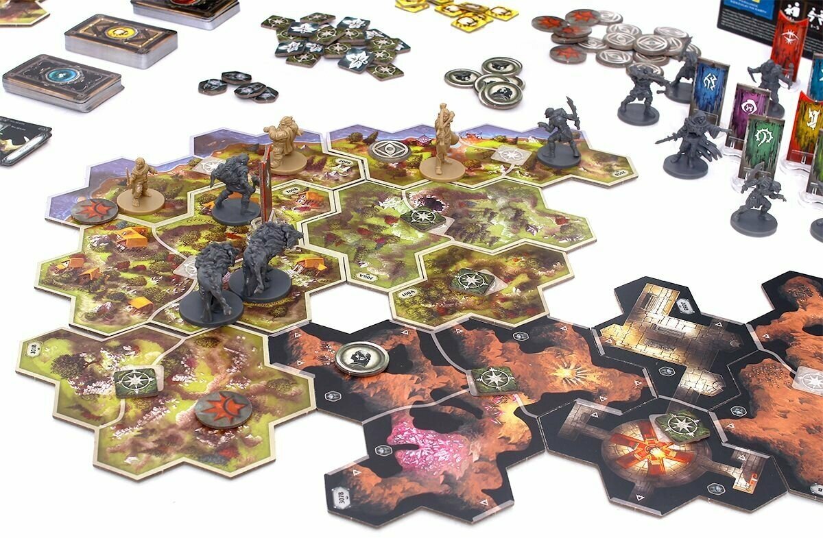 | Комплектация | Правила игры Справочник 22 двухсторонних фрагмента поля 28 карт урона 6 планшетов героев 83 карты снаряжения 15 карт преимуществ 2 поля битвы 21 карта прозвищ 30 базовых карт 30 карт героев 72 карты ролей 20 карт слабостей 10 карт местности 31 пластиковая фигурка 30 жетонов местности 12 вражеских знамён 12 пластиковых подставок 84 игровых жетона |