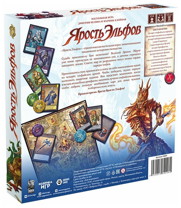 | Комплектация | 80 карт эльфийских народов (по 20 карт кждого из 4 народов) 30 карт нейтральных воинов, 5 карт Сокровищ, 7 карт секретных Целей, 20 карт Артефактов, 4 карты памяток, 44 двусторонних фишек Земель и Башен 1 жетон конфликта, 12 жетонов ранений, 1 двусторонняя карта Земель, 1 игровое поле правила игры |