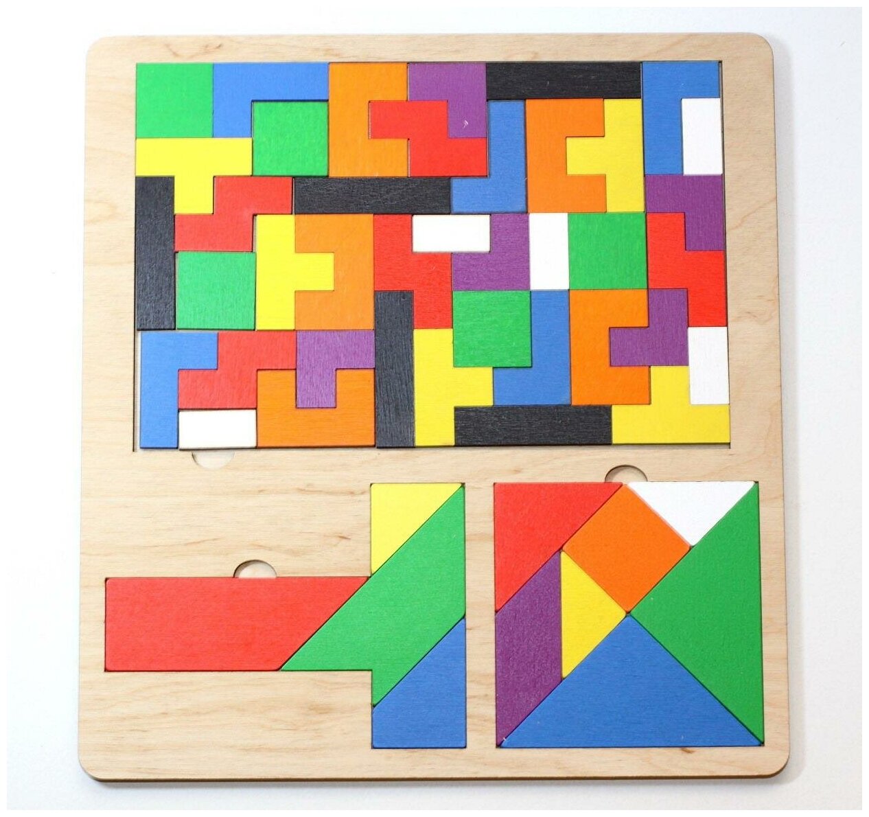 Детский пазл «TETRISWOOD» - это деревянная версия классической компьютерной головоломки «Тетрис». Состав игры: игровое поле (28,6 х 26,6 см); 3 углубления на поле (22,5 х 15 см, 13,5 х 10 см, 10 х 10 см), детали пазла детали пазла - 51 шт. (от 3 до 10 см). Материал: берёзовая фанера толщиной 4 мм. Игровое поле имеет углубление, в котором необходимо расставить пазлы различных цветов таким образом, чтобы все они уместились на игровом поле, соединяясь друг с другом. Головоломка знакомит ребёнка с понятием частей и целого, развивает логическое и пространственное мышление, мелкую моторику, зрительное восприятие, усидчивость, а также учит отличать основные цвета и формы.
