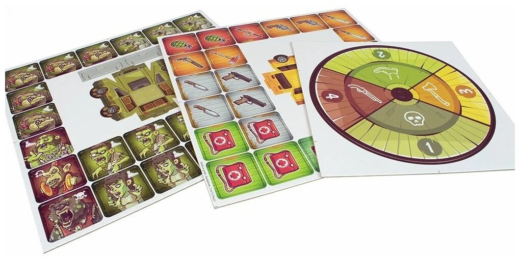 Каждый ход вы крутите вертушку, которая указывает вам некоторое количество шагов по полю, на котором разложены жетоны (рубашкой вверх, как завелось). Как только вы останавливаетесь, откройте жетон, там может быть много интересного. Самое сочное и свежее (хотя, скорее, уже нет) - это зомби. Если вы наткнулись на вашего дружелюбного соседа человека-зомби-клоуна, то вы снова крутите вертушку. Вы можете сбежать, сразиться (если у вас есть оружие) и быть укушенным. Зомби достаточно ткнуть чем-нибудь один раз - тогда он погибнет, и унесет с собой ваше оружие - такое вот оно, одноразовое. Есть еще куча интересных жетонов - оружие, аптечки и даже энергетики - чтобы пройти на две клетки больше.