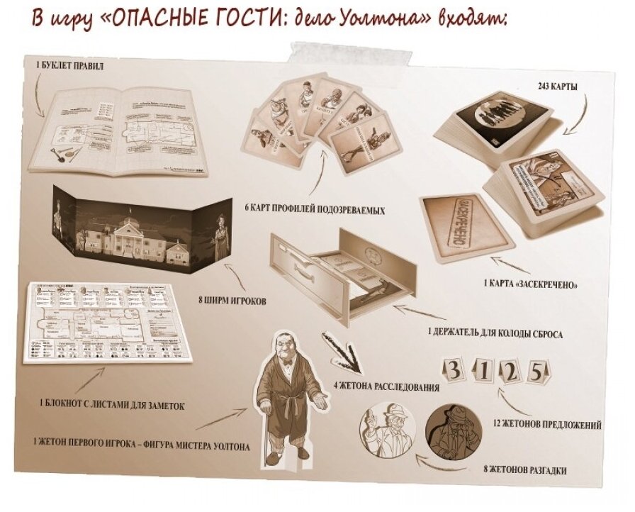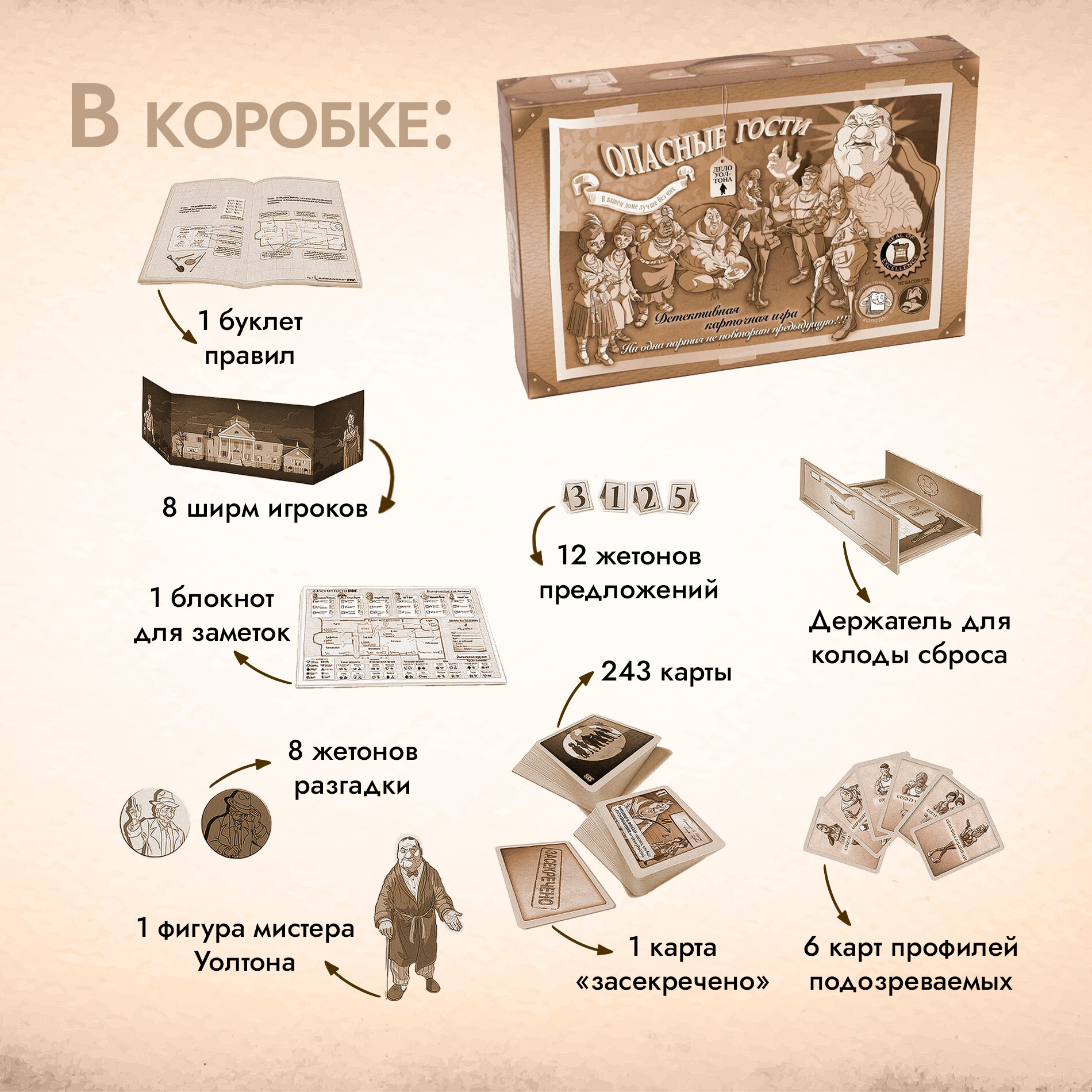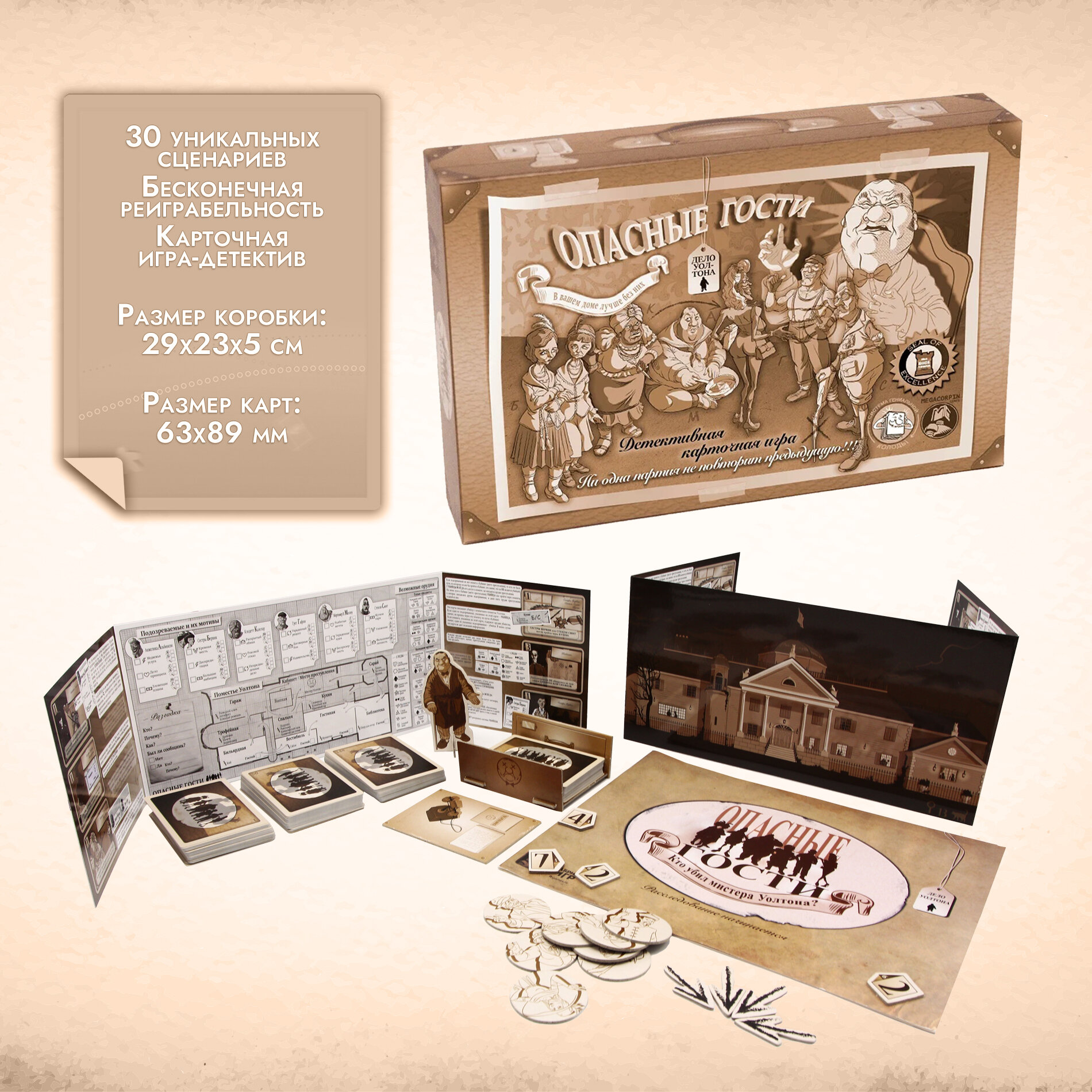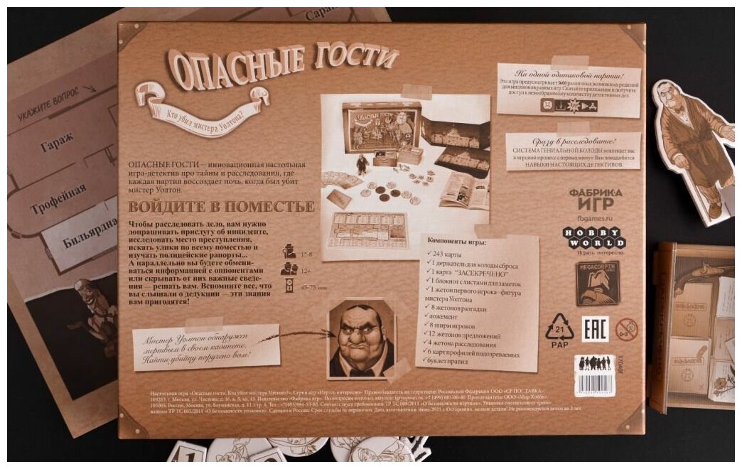 Настольная игра Фабрика Игр Опасные гости. Кто убил мистера Уолтона? позволит весело провести время в компании или в семейном кругу. Опасные гости – инновационная настольная игра-детектив про тайны и расследования, в которой сотнями разных способов воссоздается ночь убийства мистера Уолтона. Вы никогда не сыграете две одинаковые партии! Система «Гениальная колода» увлечет вас расследованием, в котором вам придется продемонстрировать настоящие детективные способности и проявить интуицию и дедукцию, чтобы решить каждое дело! Кто первым разгадает тайну и вычислит убийцу.