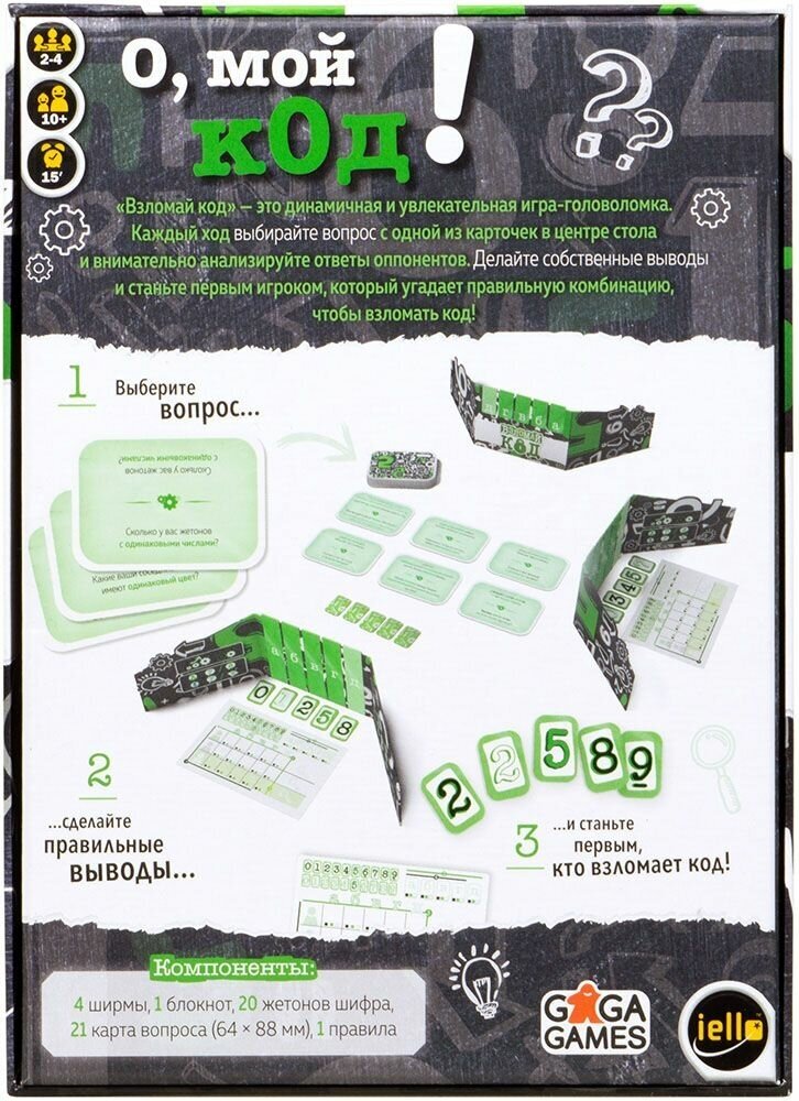 – это динамичная и увлекательная игра-головоломка. Каждый ход выбирайте вопрос с одной из карточек в центре стола и внимательно анализируйте ответы оппонентов. Делайте собственные выводы и станьте первым игроком, который угадает правильную комбинацию, чтобы взломать код!