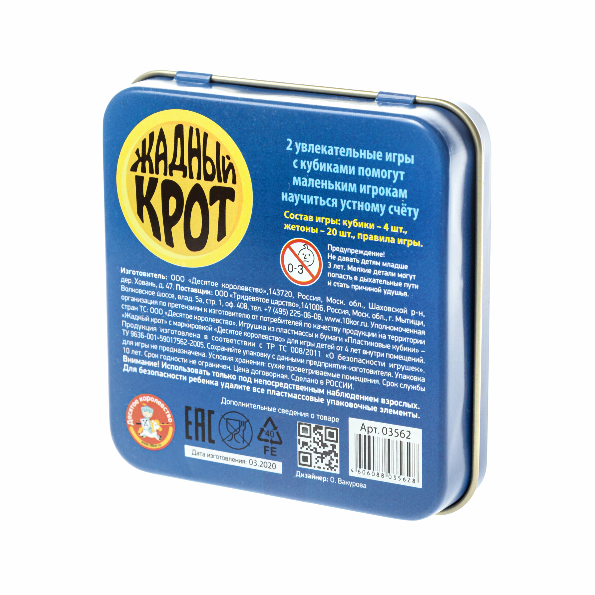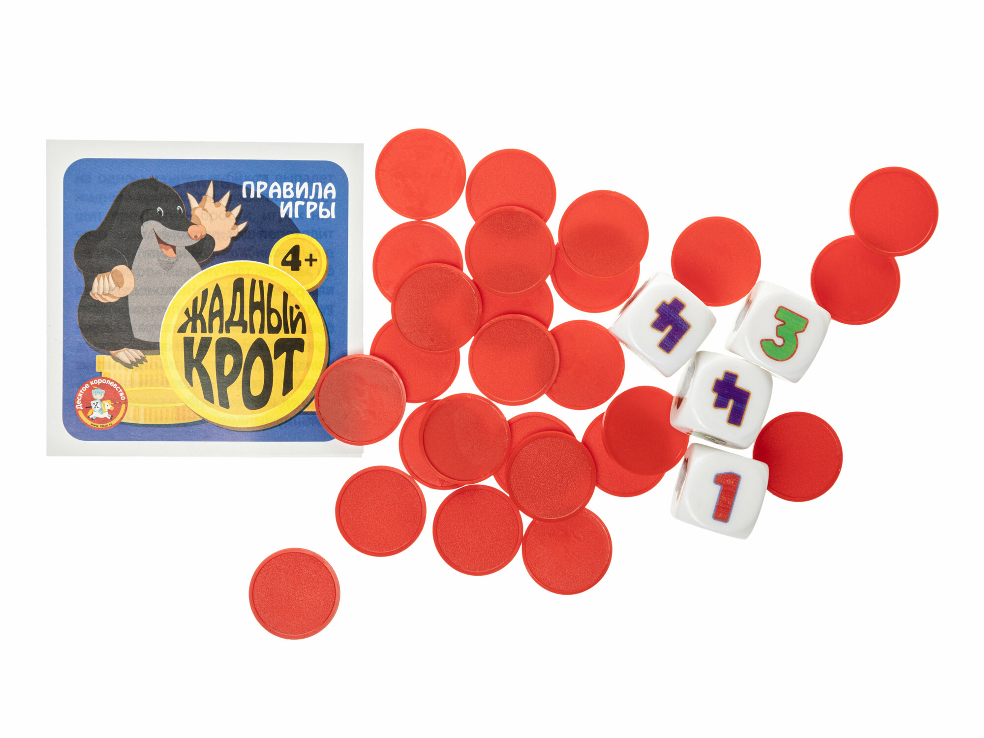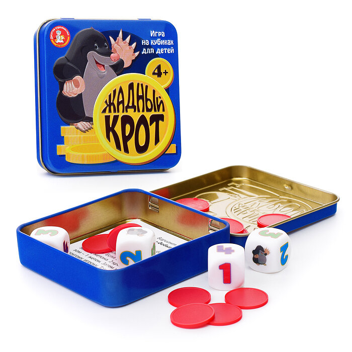 Игра учит участников выполнять правила, быстро складывать в уме и верить в удачу. Хозяйственный герой очень запаслив. Это не всегда хорошо, поэтому стоит постараться и наказать жадину.Карманная игра с кубикамиВ наборе – 4 пластиковые кости с изображением крота и цифр, 20 жетонов и правила. В игре могут принимать участие от 2 до 4 человек. Сидящим за столом предлагаются 2 варианта: простой – «» и более сложный – «Кроты добытчики».Игроки по очереди бросают по 2 кубика столько раз, сколько захотят, складывая выпавшие числа. Если на верхних гранях окажется 2 крота, это означает, что ход переходит к другому или участник теряет все свои жетоны. Чтобы набрать самое большое количество очков и победить, нужно вовремя остановиться.Компактную коробку 9х9 см с закругленными углами удобно брать с собой в гости, на дачу или в путешествие. Ребенку не придется скучать в пути.Полезное настольное состязание Интересное развлечение создает хороший микроклимат в группе, поднимает настроение и учит общаться. Увлекательная игра развивает элементарные математические представления, стратегическое мышление, память и воображение.Рассчитывайте свои шансы и остерегайтесь жадных кротов!Параметры товара: кубики 20х20х20 мм, диаметр жетонов 20 мм, упаковка – металлическая коробка 90х90х20 ммРекомендованный возраст: от 4 лет