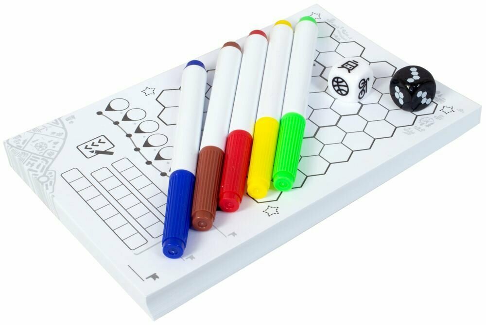 В свой ход вы кидаете два кубика. Черный определяет форму кварталов, а белый - постройки. После этого выполняете одно из трех действий. Можно закрасить квартал маркером того цвета, который у вас на руках (цвет определяет тип квартала). Это нужно сделать в форме фигуры, выпавшей на черном кубике. Ее можно вертеть, но исполнить в блокноте полностью. Можно использовать белый кубик и нарисовать постройку. Ну и наконец можно не использовать кубик, но нарисовать постройку, совпадающую с цветом маркера на ваших руках. К примеру, синий - это банк. А красный - спортплощадка. Маркеры передаются по кругу в конце раунда. Игра заканчивается, когда кто-то возведет девять построек, но победит игрок с наибольшим количеством очков - за кварталы, постройки, цели и бонусы.
