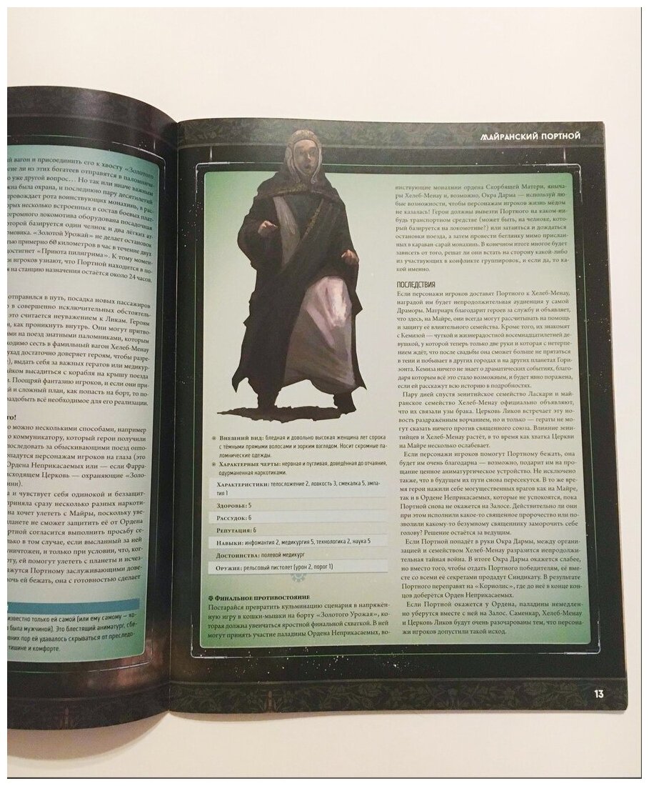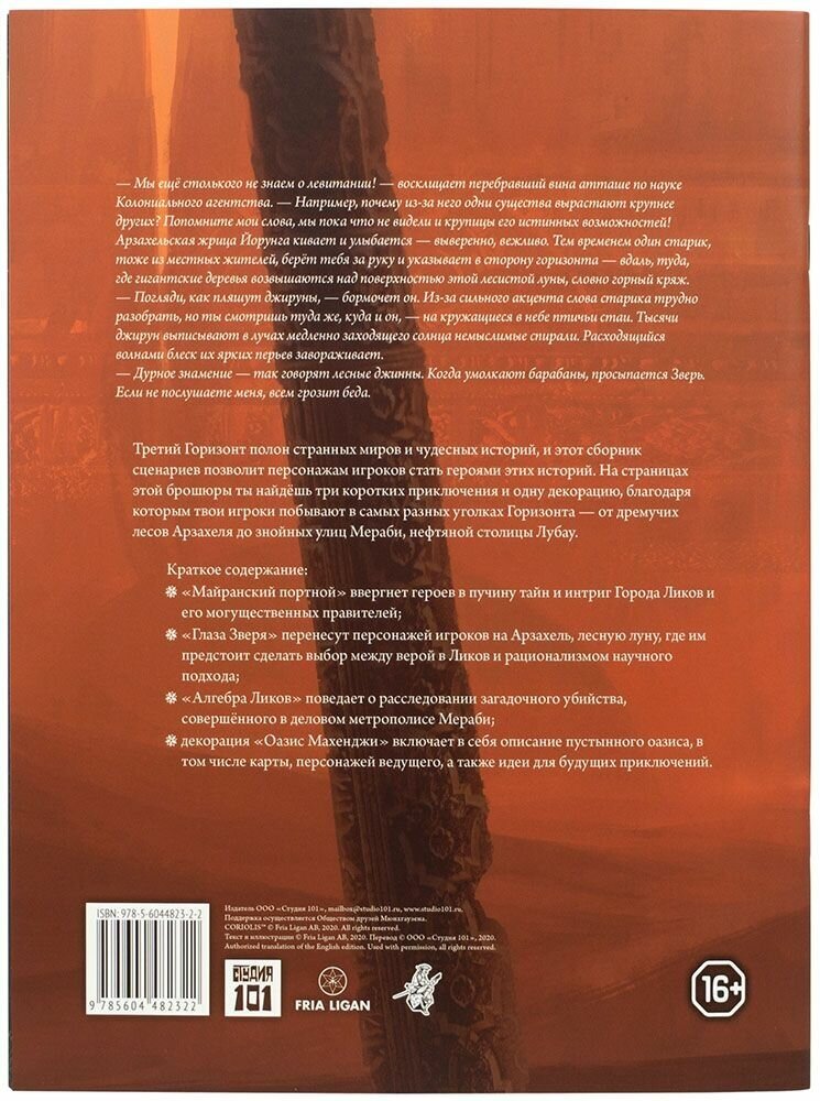 Мир "Кориолиса", Третий Горизонт – это огромная вселенная, состоящая из множества экзотических планет, каждая из которых способна рассказать игроку десятки историй с увлекательными сюжетами, и любую вы можете пережить самостоятельно! " No1" – это небольшая брошюра, которая содержит под своей обложкой три уникальных приключения, которые познакомят вас с разными гранями жизни Третьего Горизонта, а также одну декорацию – подробное описание локации в пустыне, на основании которого мастер может создать не одно приключение. Откройте брошюру и погрузитесь в мир "Кориолиса" – от дебрей Арзахеля до жаркого мегаполиса Мераби, где добывают большую чать нефти Лубау. На страницах "Сборника сценариев" вы найдёте три увлекательных приключения: окажетесь в эпицентре интриг и заговоров Города Ликов в "Майранском портном", переживёте встречу со сверхъестественным в лесных зарослях Арзахеля по ходу сюжета "Глаза Зверя", а в "Алгебре Ликов" расследуете таинственное убийство, всколыхнувшее бизнес-круги Мераби. А "Оазис Махенджи" познакомит вас с уголком жизни, окружённым жаркими песками, где вы сможете создать собственные приключения. В этом вам помогут подробные карты локации, готовые персонажи ведущего, а также наброски идей для новых сценариев. Внимание! Это дополнение. Для игры вам понадобится книга "Кориолис. Третий Горизонт".