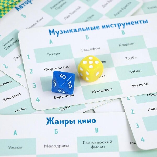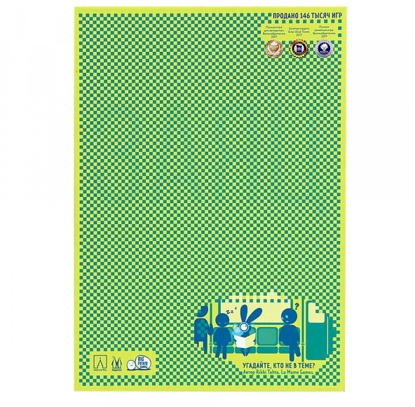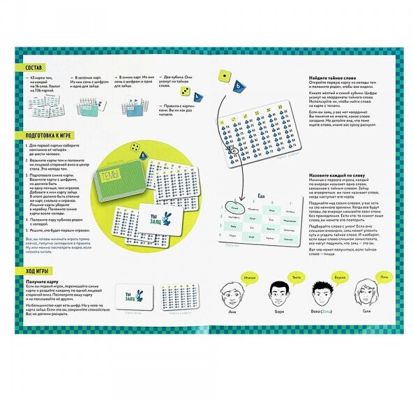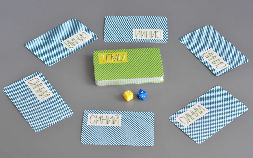 | Комплектация | 42 карты тем, на каждой по 16 слов - это 672 партии; 8 зелёных карт; 8 синих карт; 2 кубика; Правила игры |