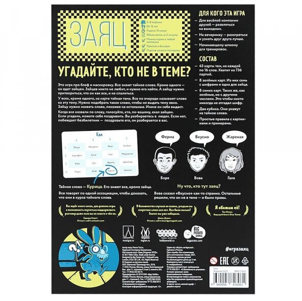 Вместо карточки с шифром один незадачливый игрок получает карточку с надписью "Ты ". Спасибо вам огромное. Если вы - , вы не знаете слово, которое сейчас на повестке. Ваша задача - не спалиться, что вы не в теме и попытаться понять, о чем говорят другие игроки. Они будут пытаться вас поймать. То есть не совсем вас, а зайца. В общем, ну вы поняли.