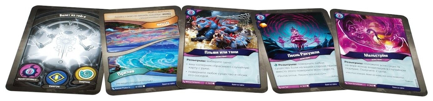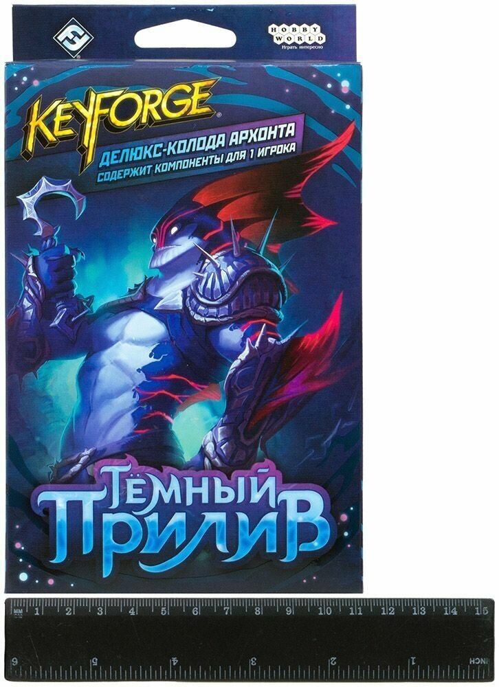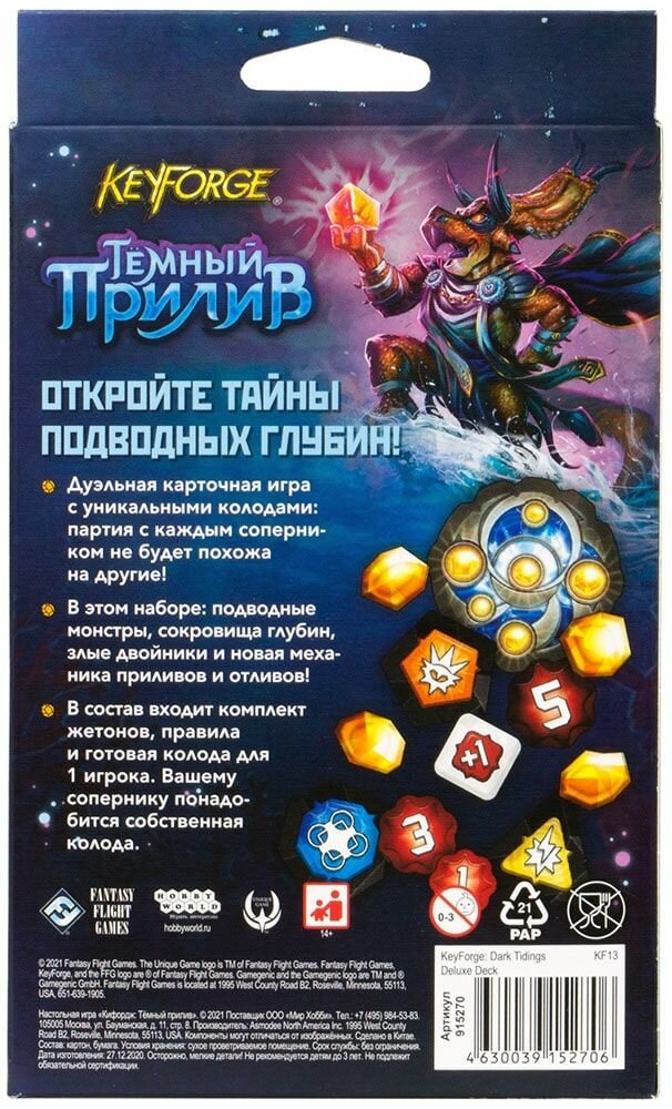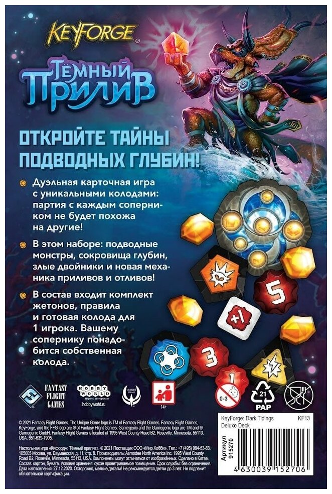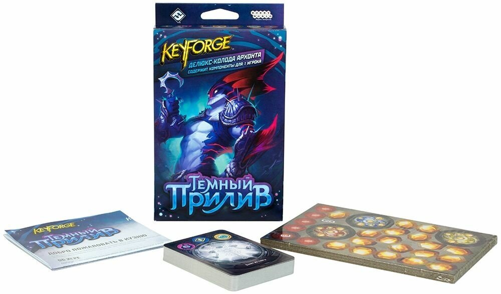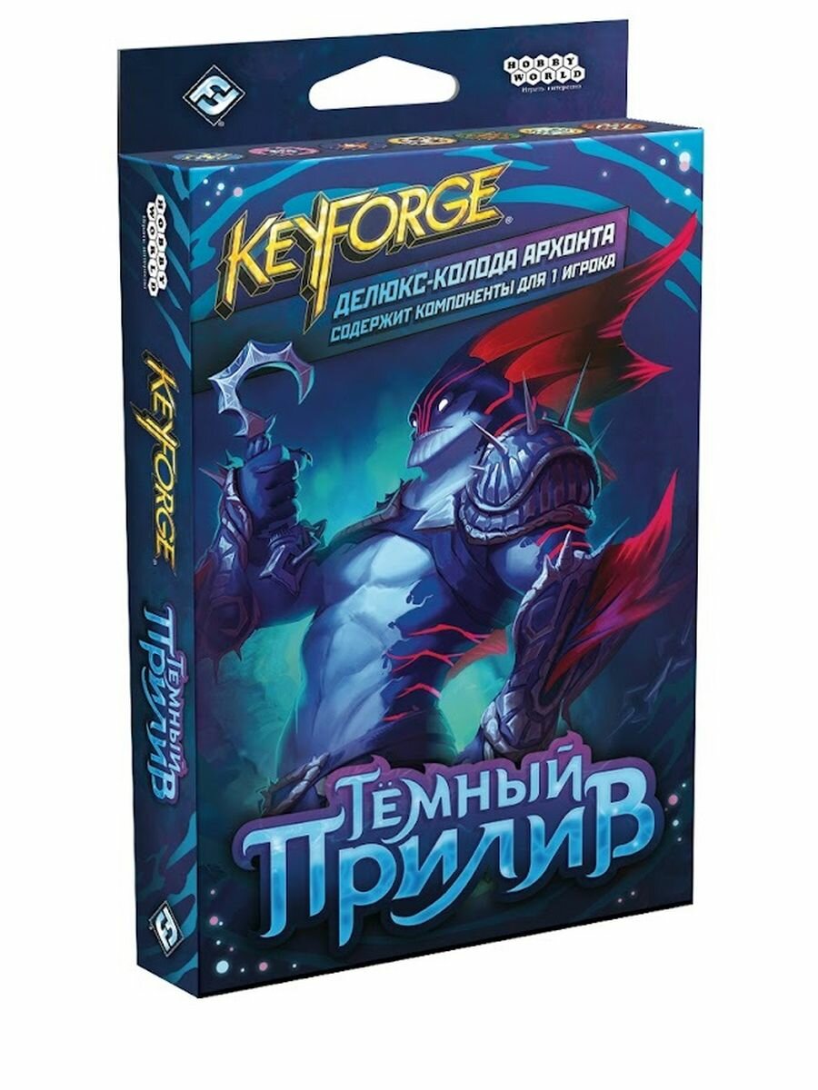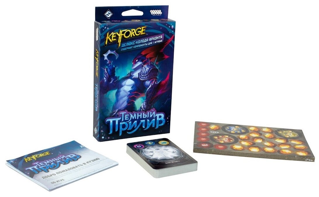 Перед вами делюкс-колода для “Тёмного прилива”. Это уже пятый выпуск легендарной ККИ Keyforge. Теперь под ваш контроль попадёт дом Непостижимых. Это подводные существа , которые заменяют дом Диса. Ещё в комплект входит карта, благодаря которой можно призвать на свою сторону силы прилива и отлива. В зависимости от того в какой именно форме находится стихия, меняются эффекты карт оппонентов.