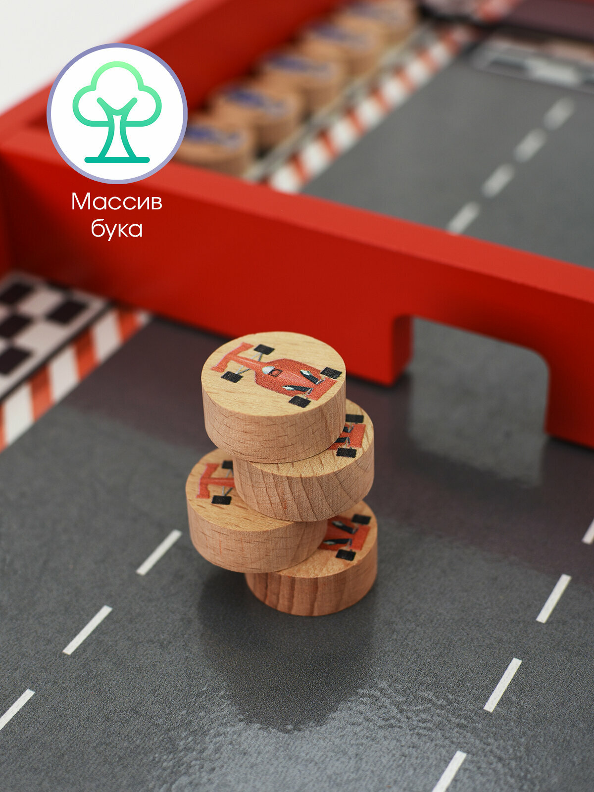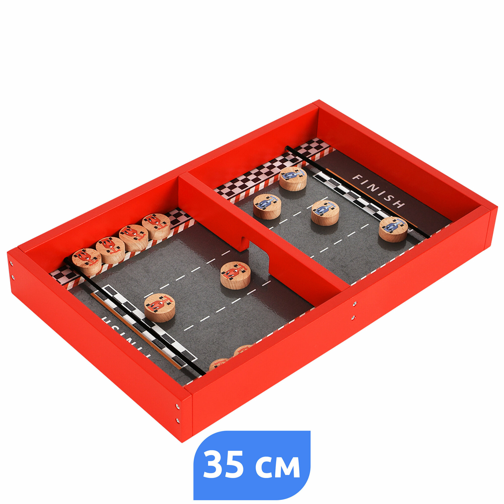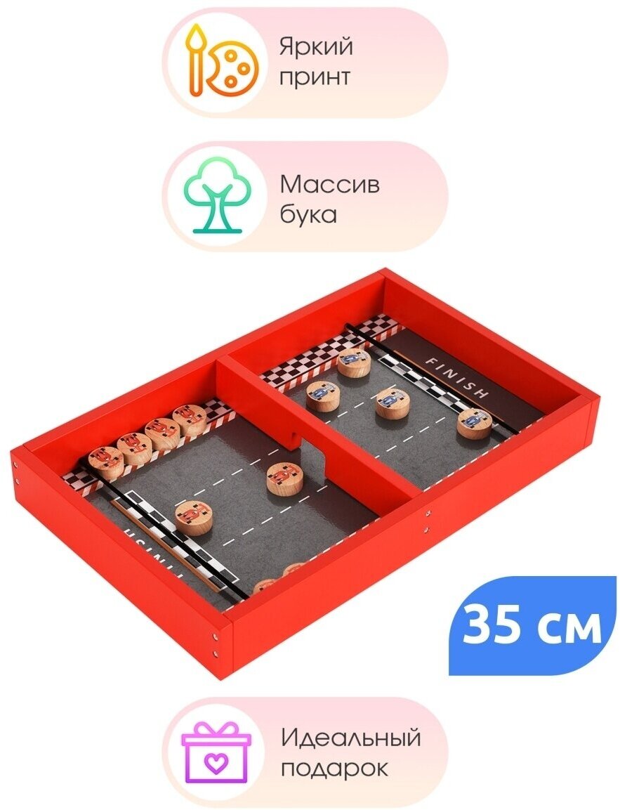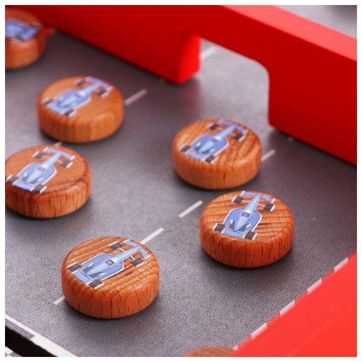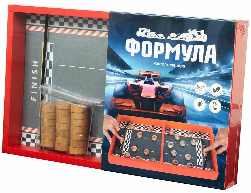 Увлекательная настольная игра, которая понравится как детям, так и взрослым. Игра соберёт всю семью в боевом турнире и станет прекрасным развлечением для весёлой компании. Участники игры получат эмоциональную разрядку, прекрасное настроение и много ярких впечатлений.Правила игры имеют 2 уровня – новичок и профи, которые отличаются по скорости и интенсивности.Играть в настольную игру «Формула» очень просто, но невероятно увлекательно. Выиграет самый быстрый, меткий, ловкий и находчивый. Игра подходит детям от 5 лет, подросткам, студентам и молодежи, а также более старшему поколению.Настольная игра представляет собой яркое тематическое игровое поле с бортами, разделённое планкой с воротами на 2 зоны. Игроки должны забрасывать шайбы на поле соперника. В арсенале каждого — 10 шайб. Задача заключается в том, чтобы быстрее соперника забросить все свои шайбы на его поле.Для коллективной игры (если в турнире принимает участие 3–6 и более игроков) применяют игру «навылет». Рекомендуется назначать арбитра и установить продолжительность тайма (например, 10 или 15 минут). Судья должен следить за временем, соблюдением правил (начинать и заканчивать броски нужно строго «по свистку») и подсчитывать количество шайб на поле каждого игрока после финального сигнала. В случае ничьей, судья может назначать дополнительные выстрелы – штрафные послематчевые броски.Настольная игра «Формула» подходит как для игры в помещении, так и на открытом воздухе. Играйте и получайте удовольствие. Проигравших не будет — все участники останутся в выигрыше!Высокое качество и безопасность порадуют игроков. Игра изготовлена из дерева, имеет полноцветную печать, нанесение производится методом прямой печати, что делает игру красочной и реалистичной. Поле с защитным слоем, который препятствует истиранию поверхности даже при длительном и активном использовании, а также обеспечивает идеальное скольжение фишек.Фишки изготовлены из натурального древесного массива, который прошёл термическую обработку и полностью безопасен. Фишки пропитаны натуральным льняным маслом и приятны на ощупь, имеют скруглённые края и нанесённый тематический принт для различия игроков на поле.Габариты поля с учетом бортиков (ШхДхВ): 355х240х45.