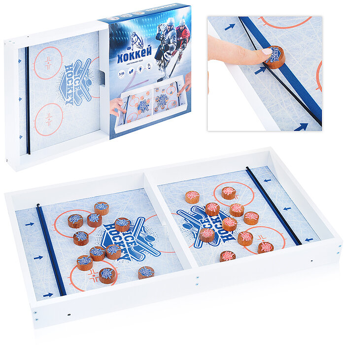 Обратите внимание - это не настольный в классическом понимании. Вам нужно будет натягивать резинку и с ее помощью загонять шайбы в небольшие "ворота" в центре коробки. В вашем распоряжении - десять шайб, которые нужно будет разделить поровну. И отправить к противнику быстрее! Можно играть не вдвоем, а большим количеством. Тогда идет принцип навылет - сражаетесь командами, а вышедшие в финал противники устраивают грандиозную схватку.