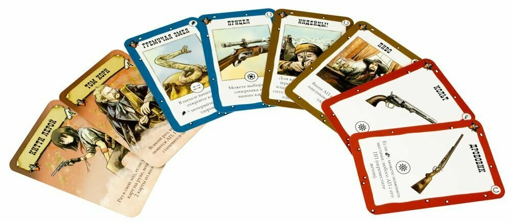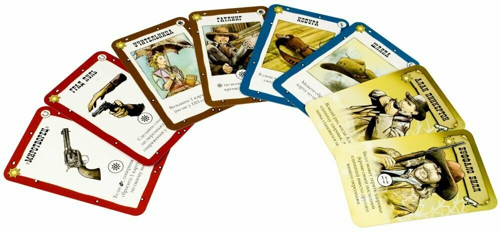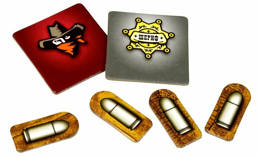 Модель представляет собой игровой набор, состоящий из множества картонных карточек с нанесенными на них яркими увлекательными иллюстрациями и подробными описаниями их свойств. Среди затейливых рисунков имеются: главарь банды со своими соратниками и слуга закона – шериф вместе с помощниками. Игра рассчитана для двоих участников и представляет собой дуэль между ними в стиле дикого запада. Для того, чтобы игра была более реалистичной, в комплекте предусмотрены специальные пластиковые подставочки, позволяющие закрепить карточки соперников друг напротив друга.