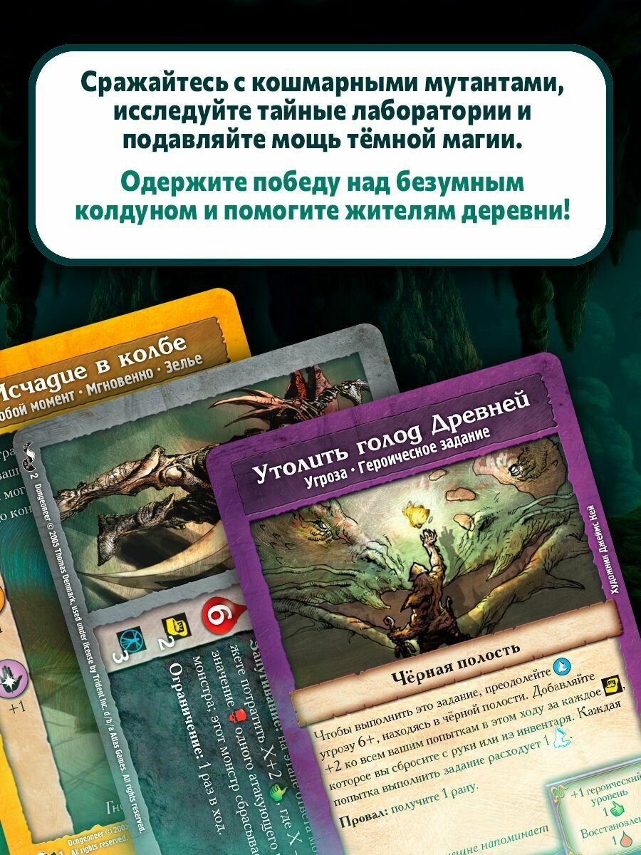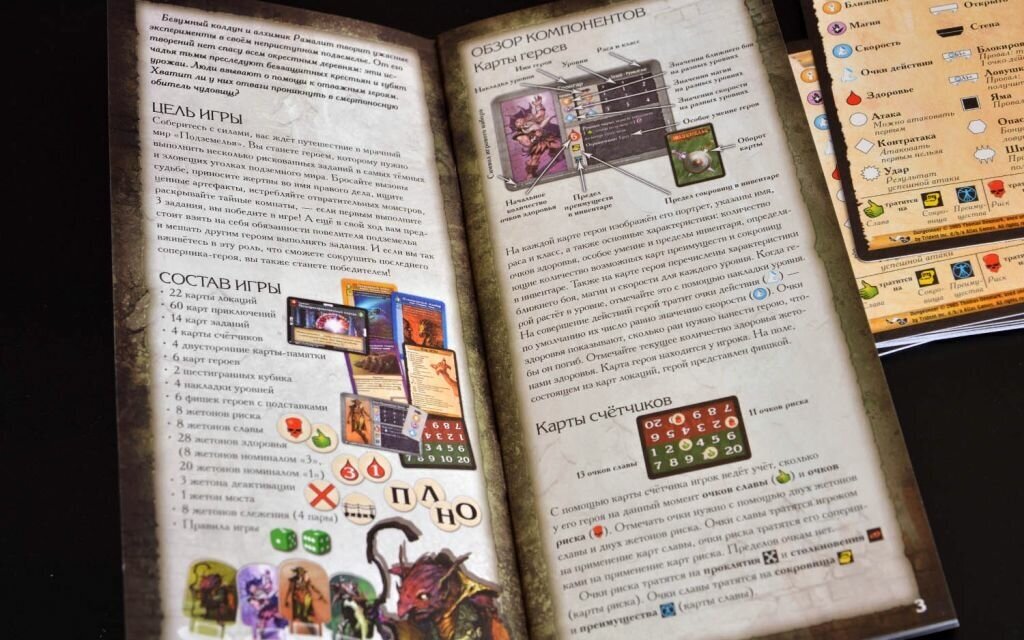 | Комплектация | 110 карт 60 жетонов 6 фишек героев с подставками 2 кубика правила игры |