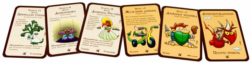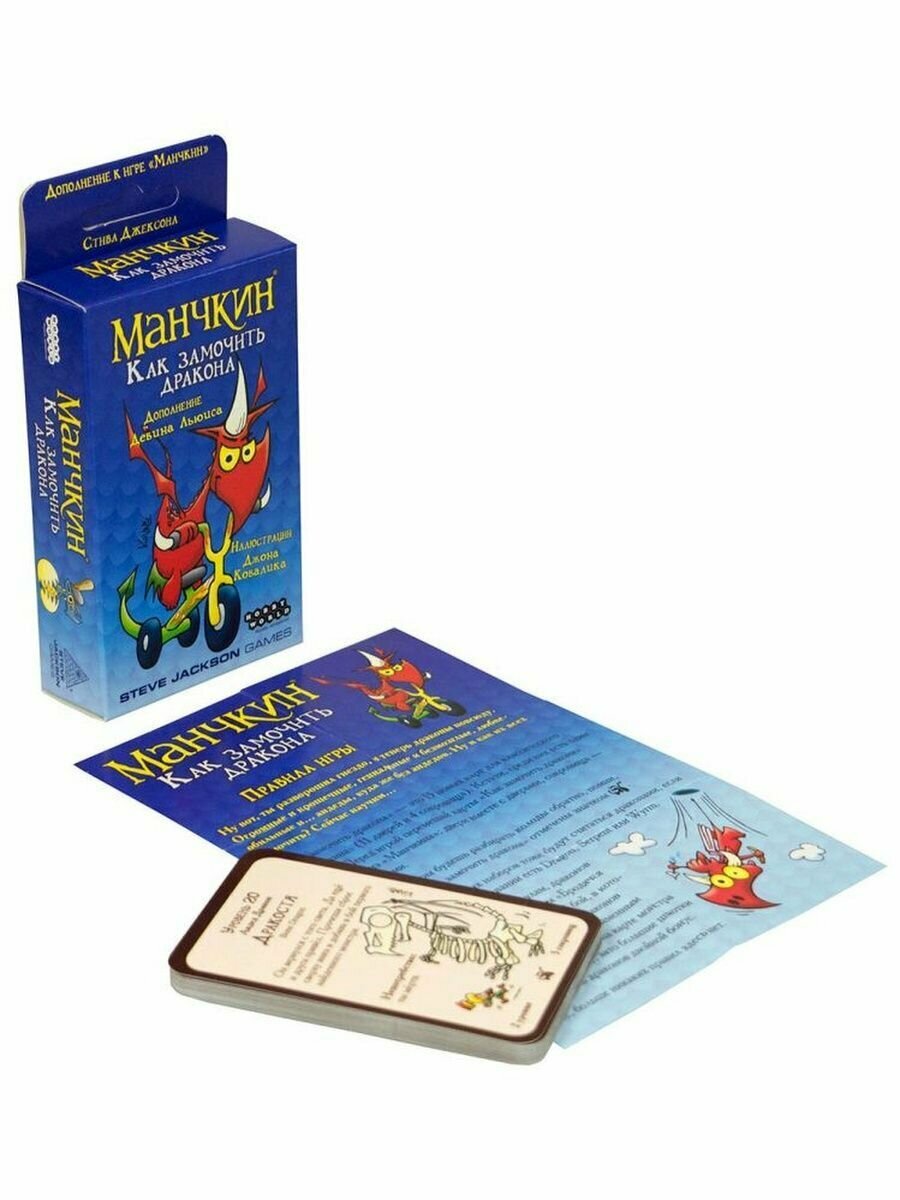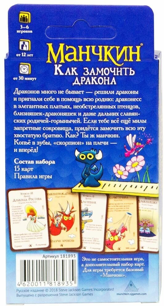 Что в коробке 15 карт Правила игры «Как замочить дракона» - небольшое, но очень захватывающее дополнение к саге Манчкин. Многообразие драконьего мира во всем своем великолепии и безумстве. Вы готовы к встрече с огнедышащими беспредельщиками? Тогда открывайте коробку с дополнением, замешивайте драконьи карточки в общую колоду и начинайте мочить драконорожденных. Пару слов о самом главном Игра «Как замочить дракона» не самостоятельная, это расширение для классической версии или любой полноценной серии из мира Манчкин. В коробке есть 15 карточек, 11, из которых это двери, а 4 – сокровища. Карточки с дракошами помечены специальным знаком отличия, чтобы игрокам было удобнее их различать. Какие сюрпризы приготовили нам драконы? Чтобы распознать дракона, нужно прочитать его имя – в нем должны быть приставки «Дракон», «Змей» или «Червь». Нужна подмога? Смело подкидывайте в бой других монстров без использования карточки Бродячей твар