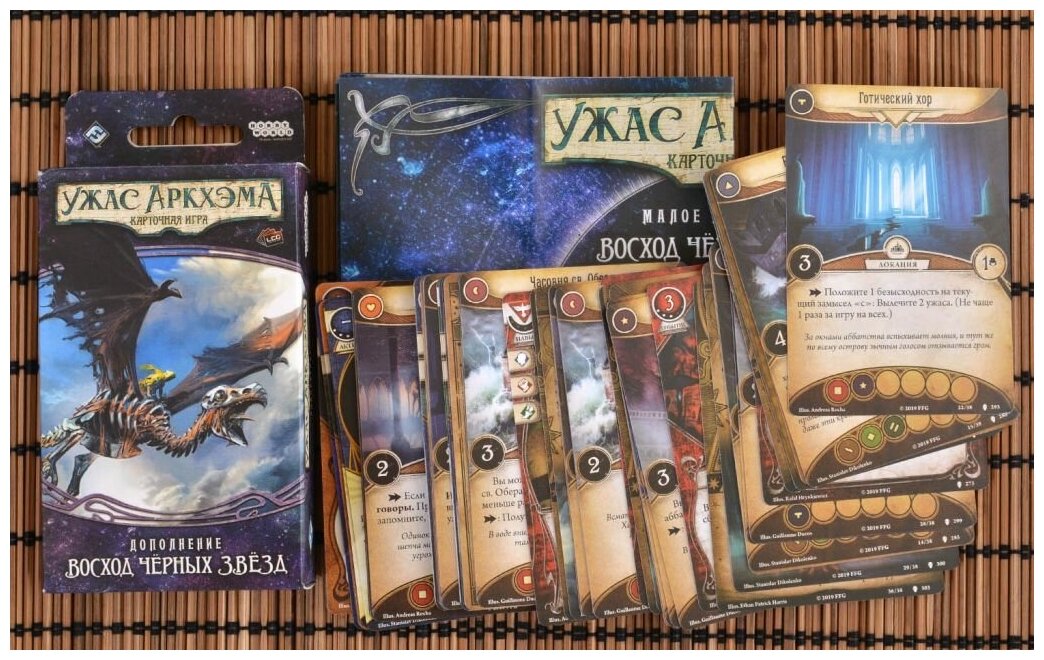 "Восход чёрных звёзд" – седьмой сценарий сюжетной кампании "Путь в Каркозу", в котором сыщики окажутся на самом краю безумия, застигнутые бурей у стен древнего аббатства на острове Мон-Сен-Мишель. Это малое дополнение состоит из 60 карт. Сюда входят новые карты игроков для развития и улучшения ваших колод и новый сценарий, который можно пройти как в одиночном режиме, так и в рамках кампании "Путь в Каркозу". Набор содержит карты 263–303 кампании "Путь в Каркозу" и лист сценария.Внимание! Для игры вам понадобятся базовый набор карточной игры "Ужас Аркхэма" и большое дополнение «».