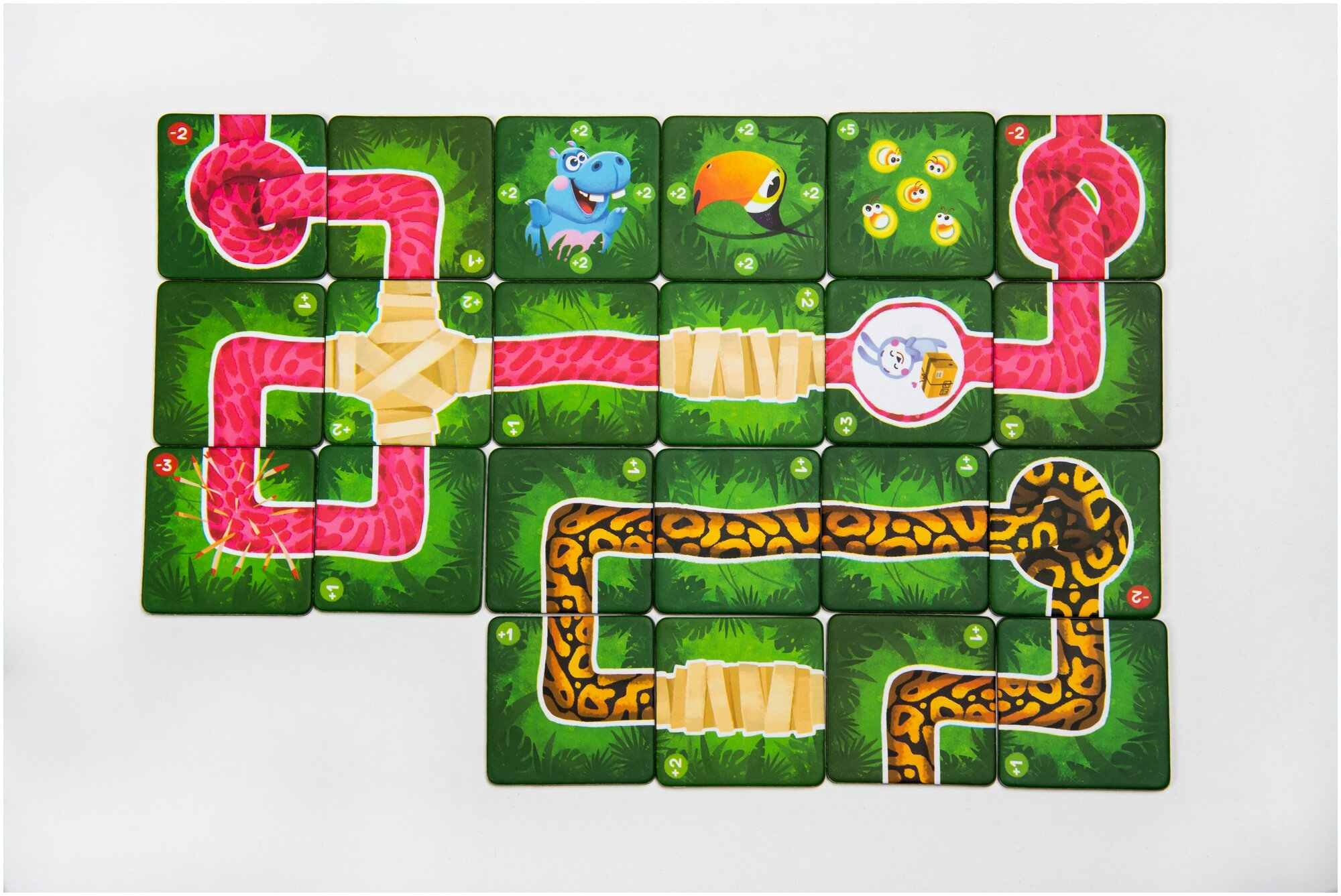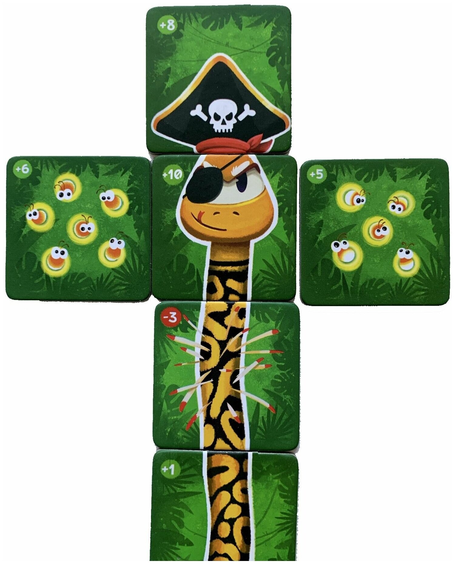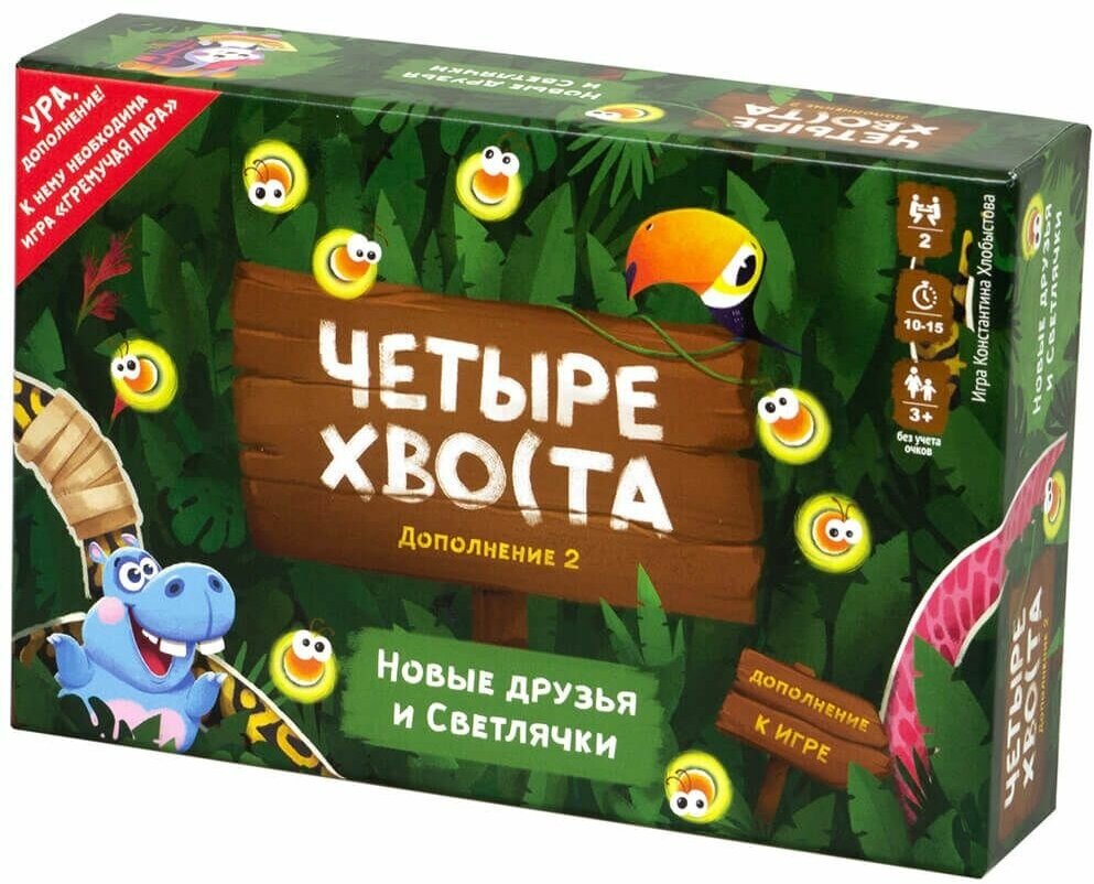 В джунглях всегда можно найти что-то интересное – разумеется, если знать, где искать. А с Дополнением 2. "Новые друзья и Светлячки" возможностей встретить что-нибудь удивительное только прибавляется.Новые друзья и светлячки – это дополнение к настольной игре «Четыре хвоста 2. Гремучая пара», которое помогает разнообразить игру с помощью новых правил и компонентов, но без усложнений.Теперь в игре появились два новых персонажа - бегемот Хипо и тукан Барабан!Любопытные кролики стали гулять по джунглям, принося разное количество очков. Придется подумать, как лучше разыграть эти тайлы!Кто-то освещает путь любимым питонам? Познакомьтесь, это Светлячки! Подлетая к голове, светлячки не подпускают кусачих москитов. Распутывайте узлы и лечите колючки, благодаря дополнительным бинтам. Больше тайлов, больше стратегических ходов, больше веселья!Дополнение позволяет по-новому взглянуть на игру даже тем, кто отыграл немало партий в базовую игру.внимание: это не самостоятельная игра! Для игры вам потребуется базовая игра «Четыре хвоста 2. Гремучая пара». Объединяйте все части игры «Четыре хвоста» в одно невероятное приключение! В линейку игр «Четыре хвоста» помимо основной игры входят: игра «Гремучая пара», Дополнение 1 «Улетные кокосы и Шляпы» и Дополнение 2 «Новые друзья и Светлячки». Кто из питонов вырастет самым длинным? Их хвосты в твоих руках!