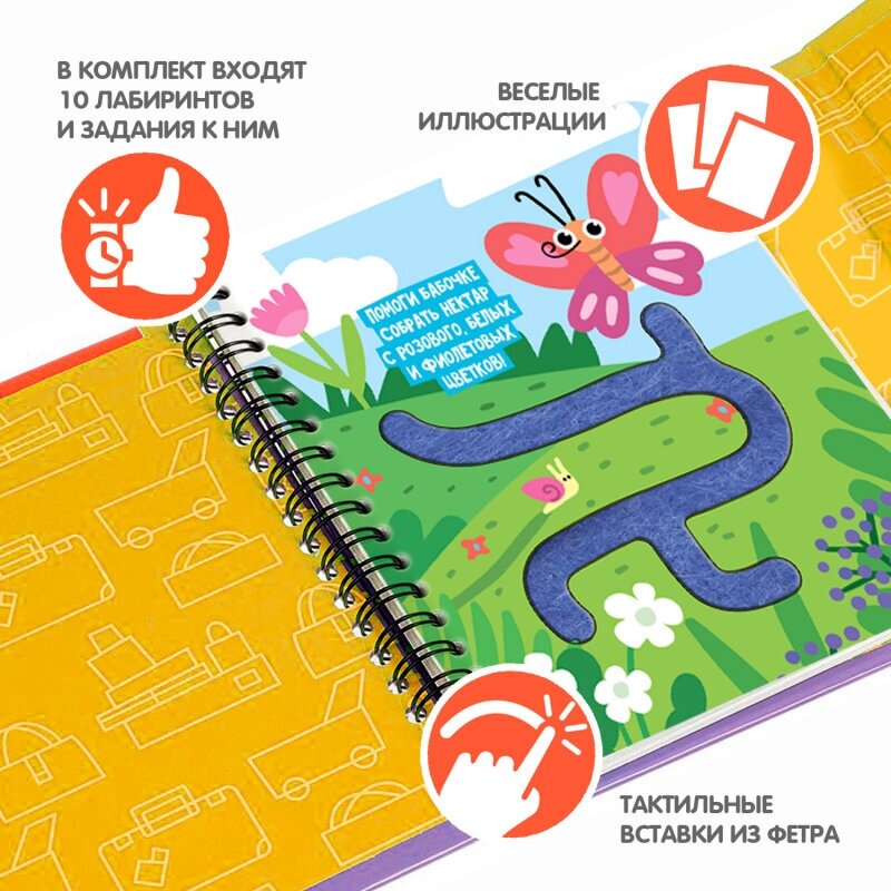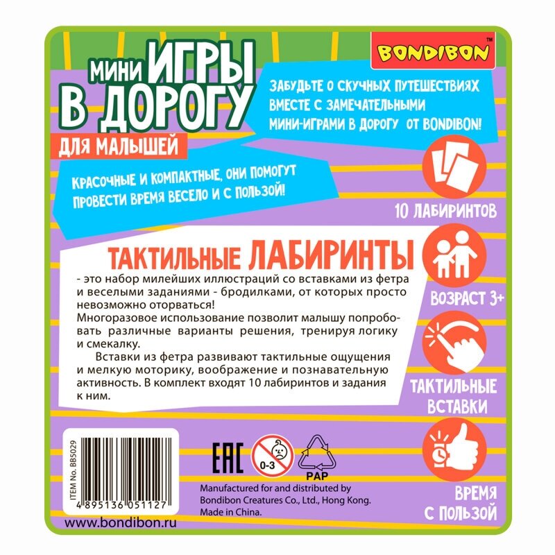 Bondibon Мини-игры в дорогу для малышей со вставками из фетра Как занять ребенка в дороге? Возьмите с собой удивительную игру от Bondibon из серии Мини-игры в дорогу! Это комплексный весёлый тренажёр, который воздействуя на кончики пальцев малыша, помогает развивать мелкую моторику рук и сенсо́рные ощущения, а также научит различать текстуры и цвета. Дорожки из фетра выделяются на фоне гладкого картона. Лабиринты очень полезны в любом возрасте: глазки смотрят - пальчики двигаются, не отрываясь от дорожки. Это уникальное упражнение на внимание и самоконтроль, с каждым разом ребенку будет легче удерживать внимание. Выполняйте задания, используя детали из набора Играть можно как одному, так и с компанией В комплекте: 10 ярких лабиринтов и интересные задания к ним Возраст: 3+