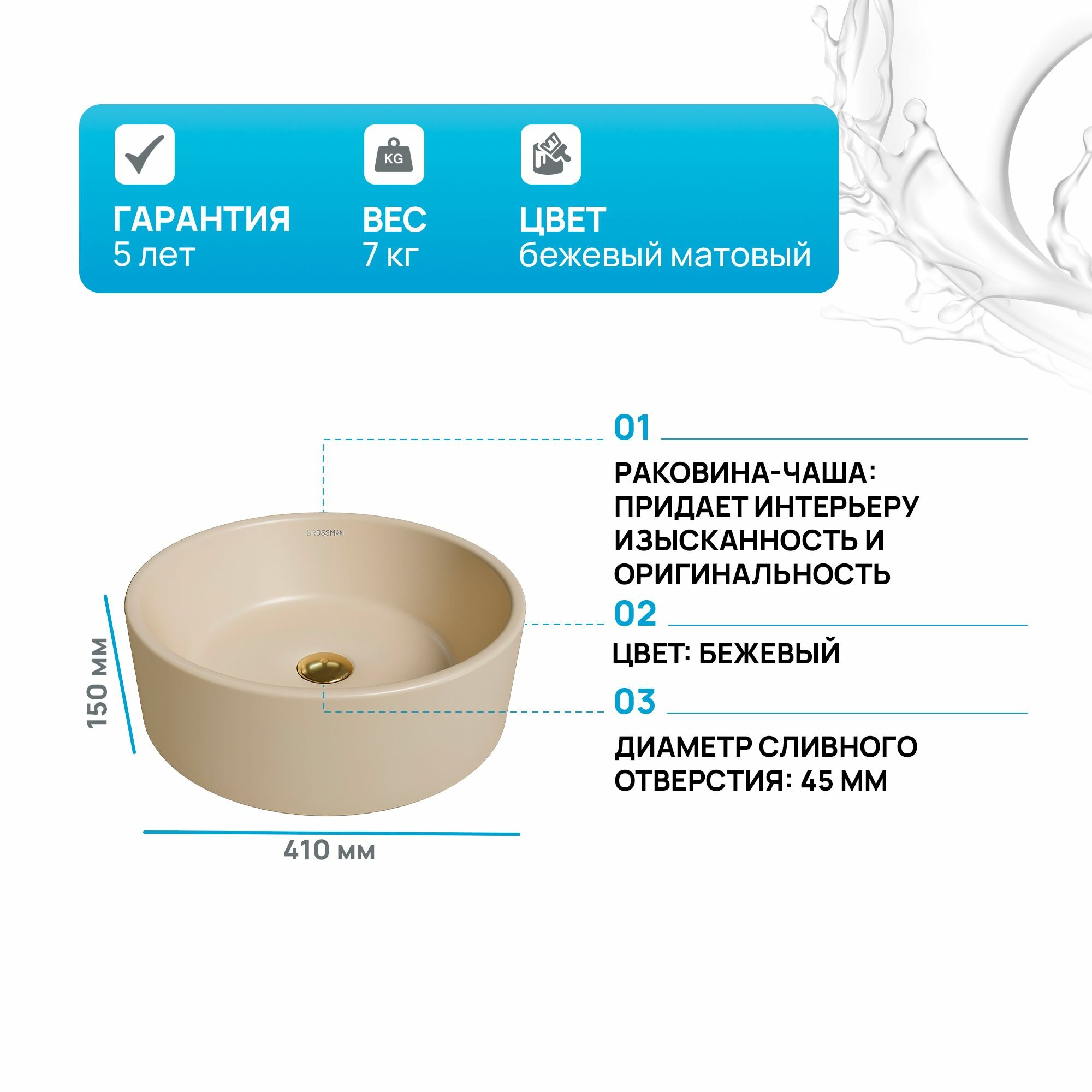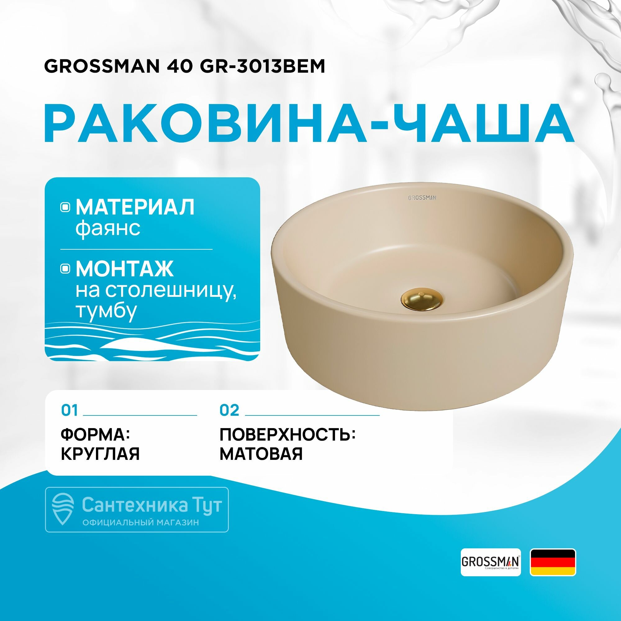 Раковина Grossman GR-3013BEM (400*400*120) накладная, бежевая матовая, слив-перелив - установка невозможна, донный клапан - приобретается отдельно, слив-перелив - установка невозможна, донный клапан - приобретается отдельно, диаметр слива - 4,5 см.