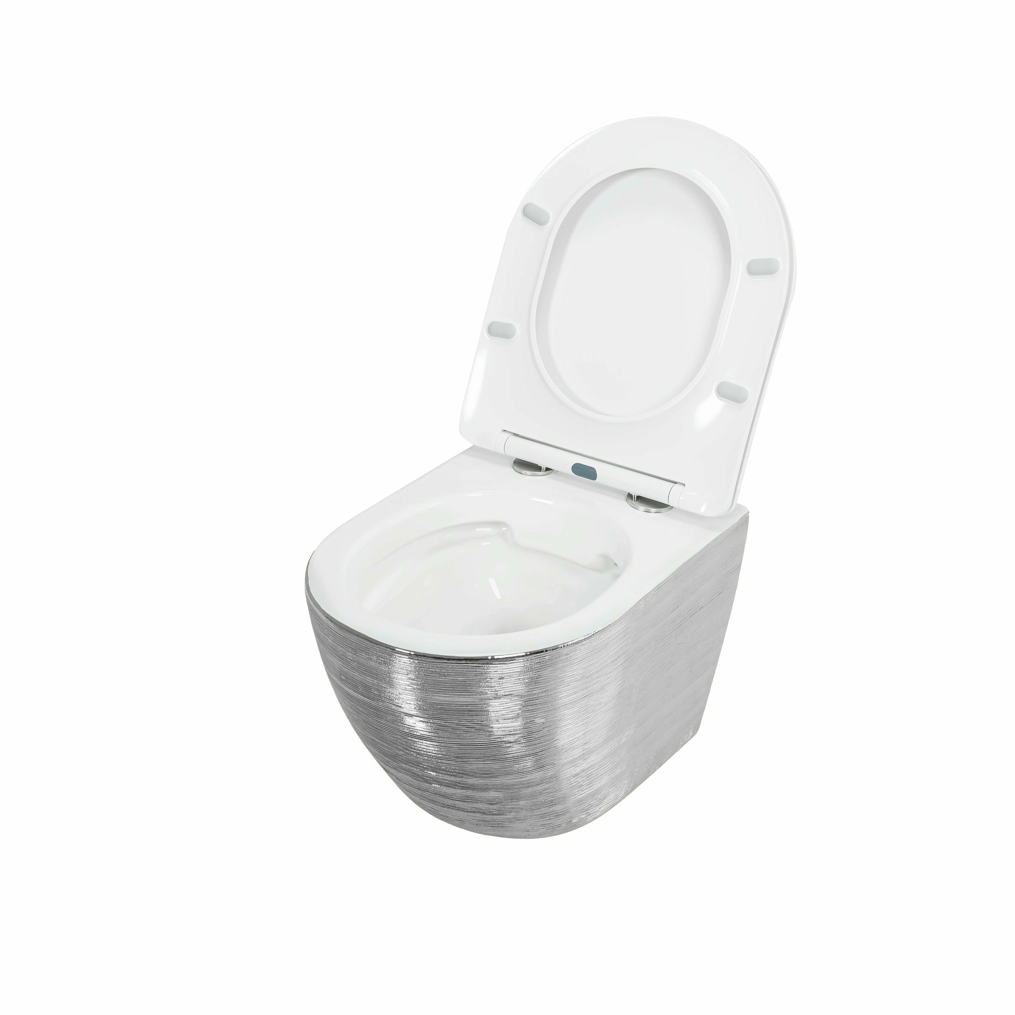 Подвесной унитаз Grossman GR-4455SWLS (480*365*370) серебро, внутри белый, безободковый с тонкой крышкой, режим слива воды определяется механизмом системы инсталляции, механизм слива определяется системой инсталляции, метод установки сливного бачка в стену (скрытый), система антивсплеск.