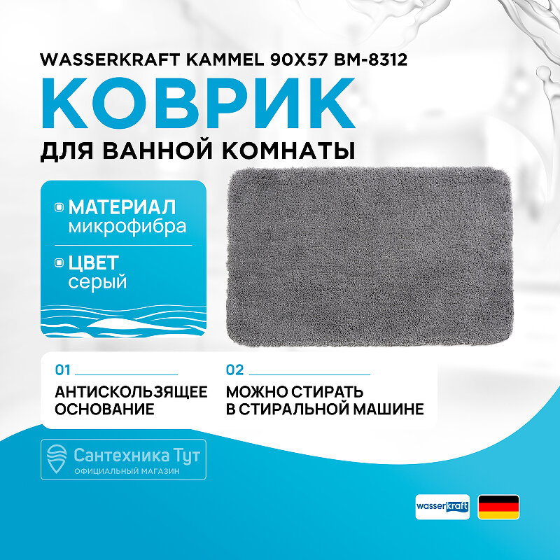 Коврик для ванной WasserKRAFT Kammel BM-8312. Материал: Антискользящее основание (термопластичная резина), микрофибра. Покрытие: Микрофибра. Размер 57х90см, высота ворса 30мм. Коврик подлежит машинной стирке при температуре не выше 30 градусов в режиме бережной стирки.