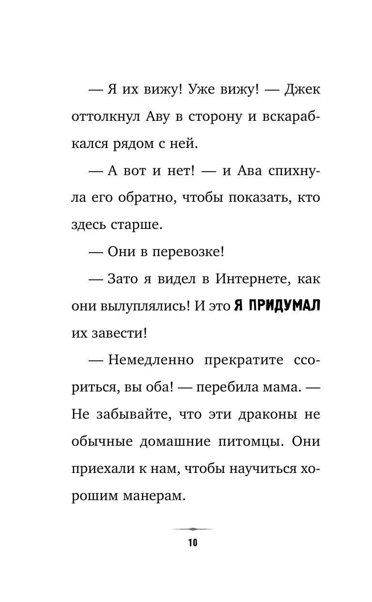 У Джека и Авы есть мама, папа и два дракона. Самых настоящих дракона! Семья Уорд взяла их на воспитание. Дракончики ещё маленькие, и им надо учиться жить в одном мире с людьми. Папа и мама умеют воспитывать человеческих детей (у них же есть просто замечательные Джек и Ава), а как воспитывают драконов — совсем не знают. И пособий нет. Придётся брату и сестре брать дело в свои руки. Смогут ли они справиться?