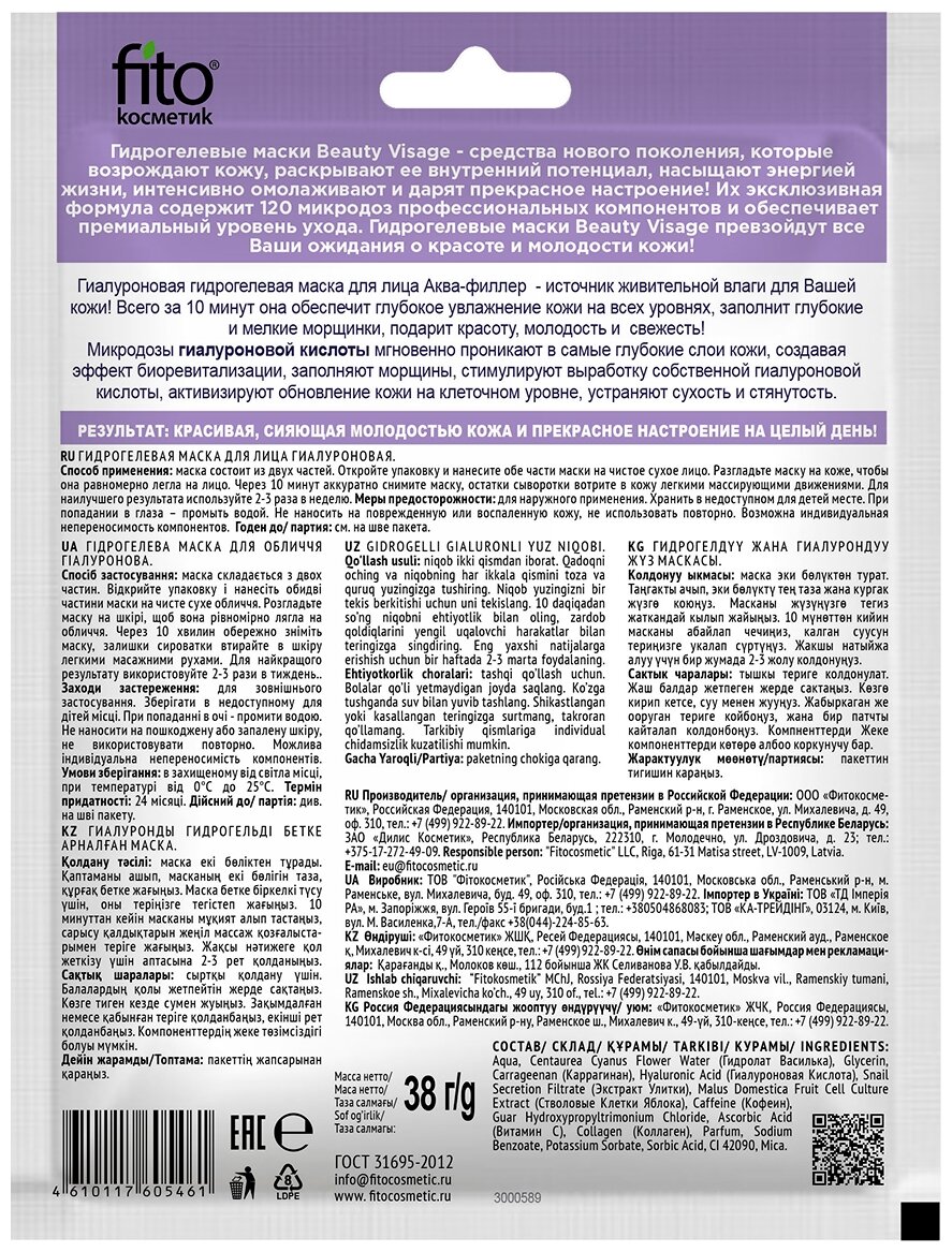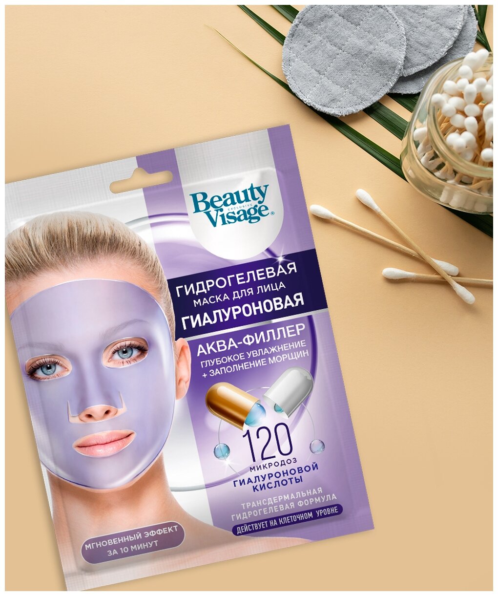 Маска для лица Beauty Visage Гидрогелевая Гиалуроновая Аква-филлер 38г Fito косметик
