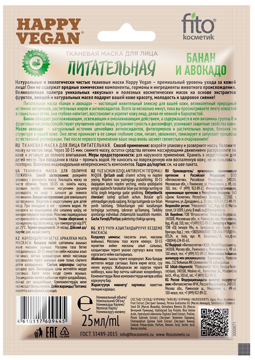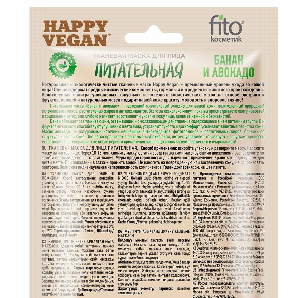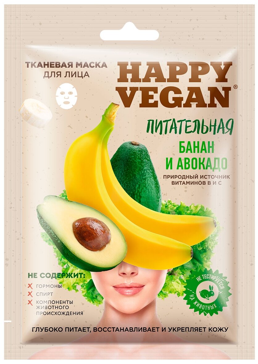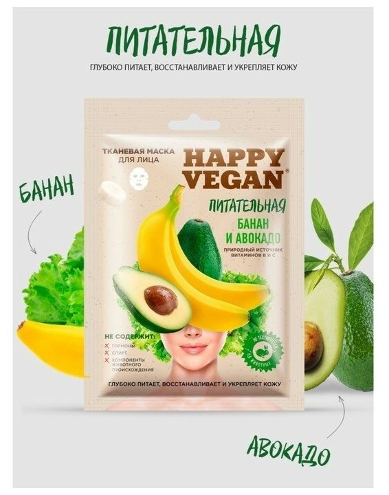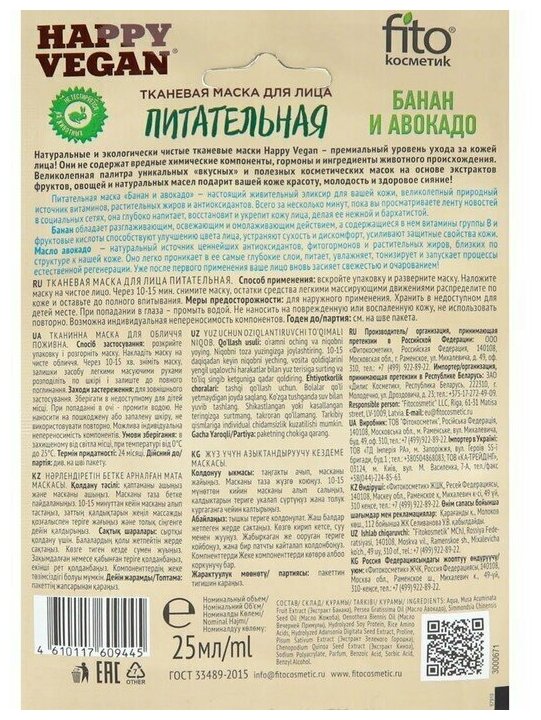 Маска для лица Happy Vegan тканевая Питательная Банан и авокадо 25мл Fito косметик