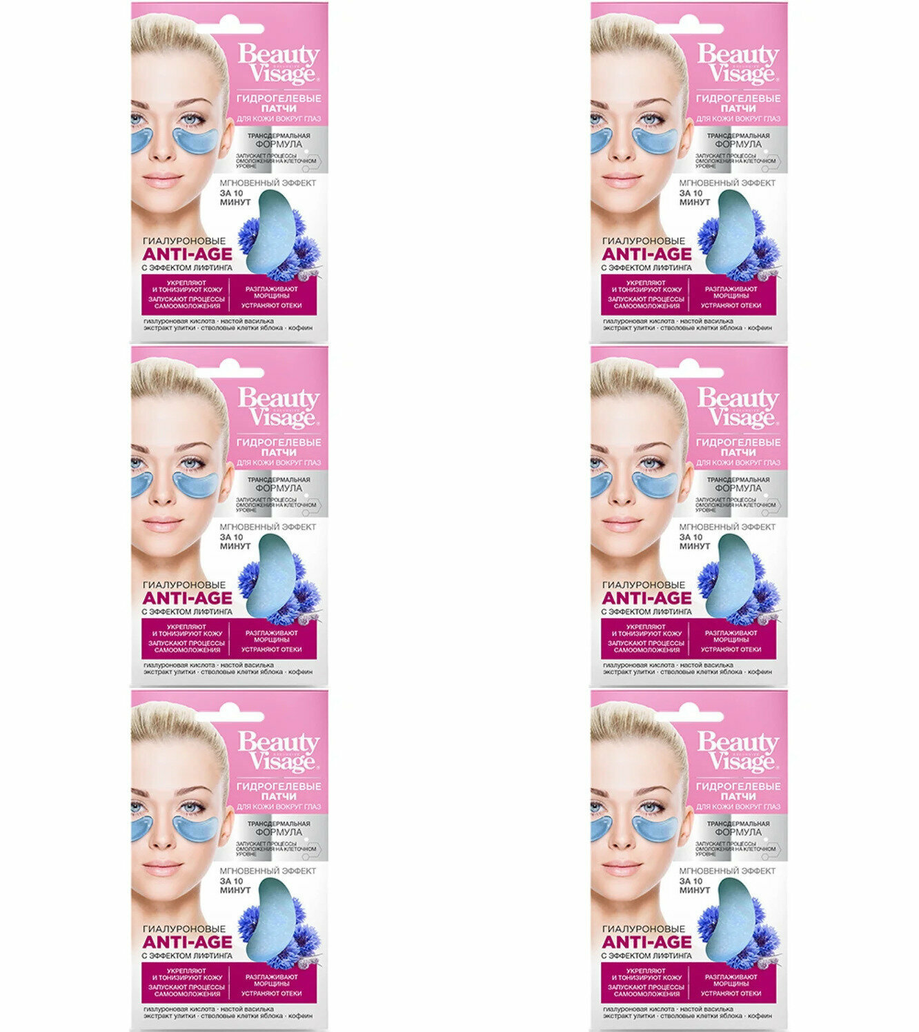 Fito Косметик Патчи для кожи вокруг глаз Гидрогелевые Гиалуроновые ANTI-AGE "Beauty Visage", 7г, 6 штГидрогелевые патчи для кожи вокруг глаз Anti-Age способны всего за 10 минут сотворить настоящее чудо! Они не только разглаживают мелкие морщинки, устраняют отеки, но и запускают процессы естественного омоложения и регенерации на клеточном уровне. Низкомолекулярная гиалуроновая кислота проникают в самые глубокие слои кожи, притягивая и удерживая в них влагу. Настой василька — ценный источник витаминов и антиоксидантов, оказывает укрепляющее и тонизирующее действие. Экстракт улитки — питает и восстанавливает нежную кожу вокруг глаз. Стволовые клетки яблока — увеличивают выработку естественного коллагена и эластина, повышают упругость и гладкость тонкой кожи век. Кофеин способствует устранению отеков и темных кругов под глазами.