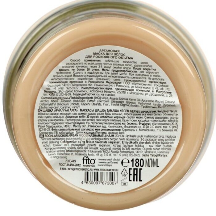 Маска для волос Свежая косметика Аргановая для роскошного объема 180мл ФИТОКОСМЕТИК