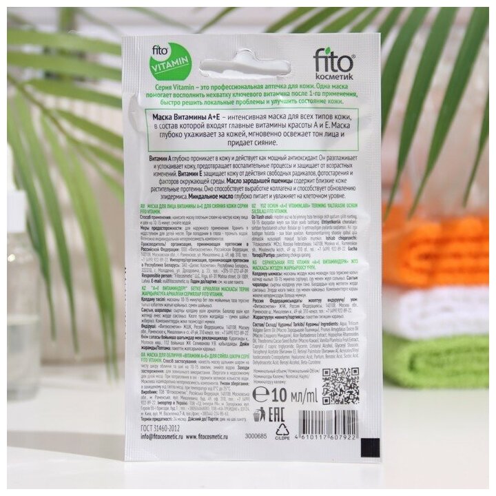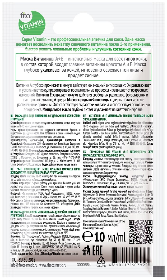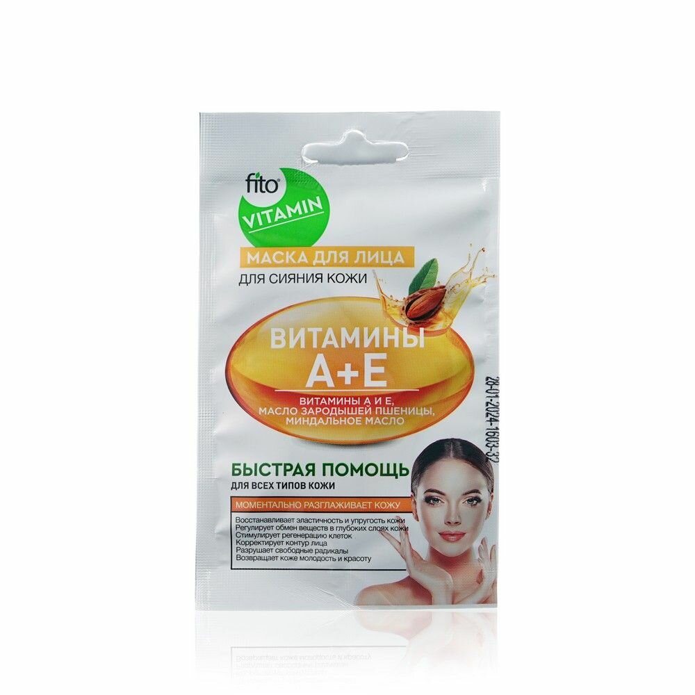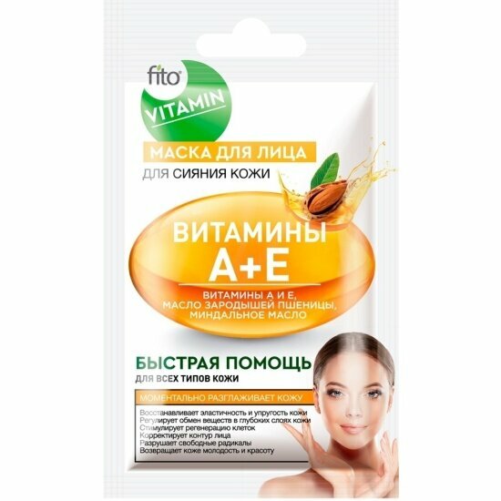 Маска для лица Fito Vitamin Витамины А+Е для сияния кожи 10мл ФИТОКОСМЕТИК