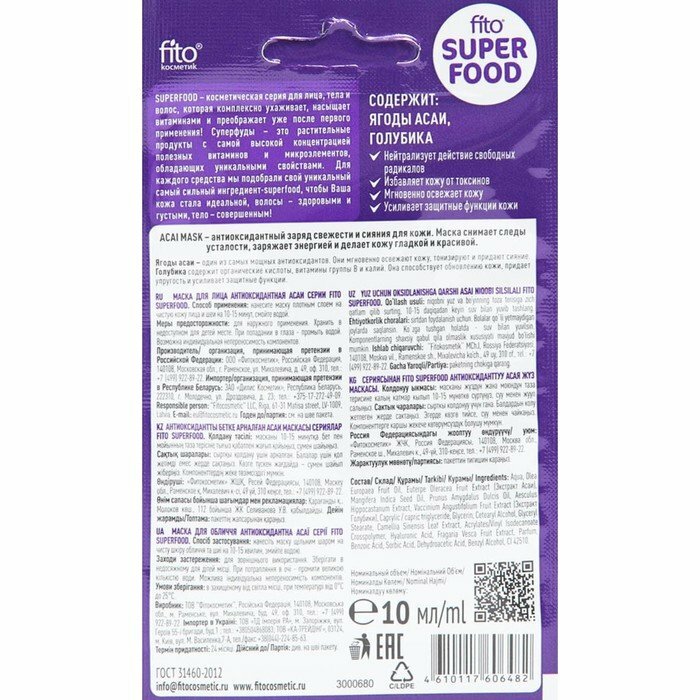 Маска для лица Fito Superfood Антиоксидантная Асаи 10мл ФИТОКОСМЕТИК