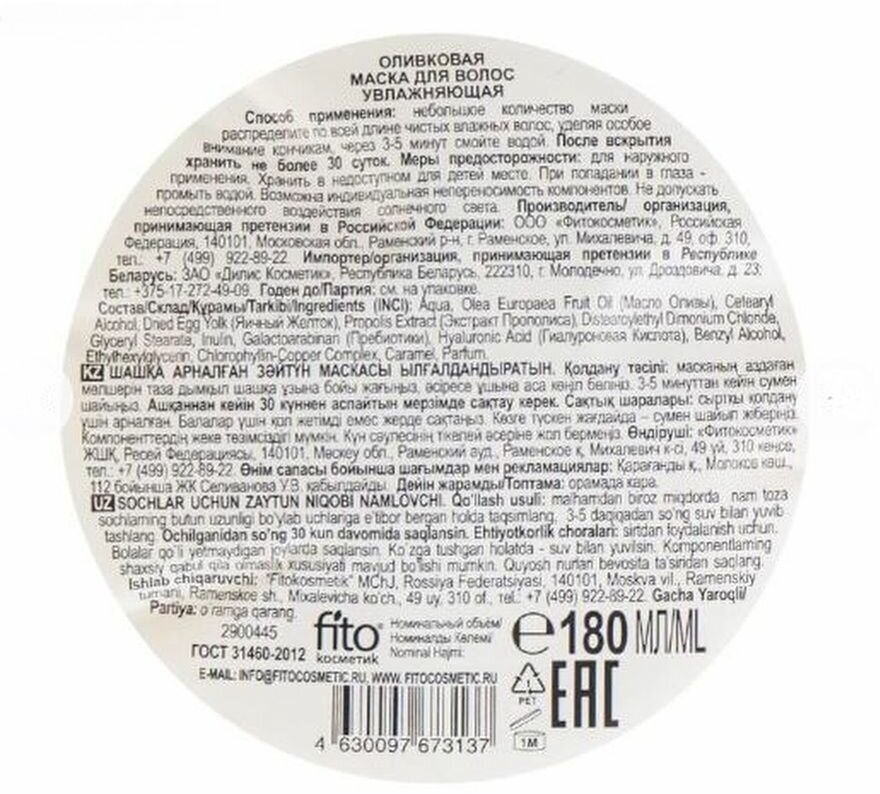 Маска для волос Свежая косметика Оливковая Увлажняющая 180мл ФИТОКОСМЕТИК