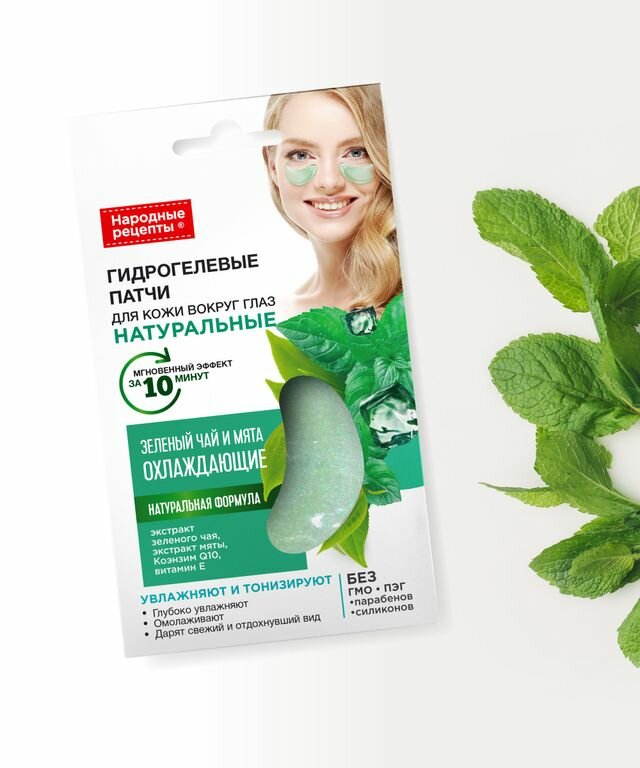 Гидрогелевые патчи для глаз Народные рецепты Увлажняющие уменьшают отечность и следы усталости. Экстракт петрушки в составе — тонизирует, увлажняет и питает, помогает осветлить тон и пигментные пятна. Экстракт мяты освежает, успокаивает раздражения и покраснения. Экстракт мелиссы возвращает упругость и эластичность, придает мягкость и бархатистость. Каррагинан снижает видимость морщин, повышает тонус. Гиалуроновая кислота удерживает влагу и поддерживает водный баланс. Плотно прилегают и не сползают. Эссенция быстро впитывается, не оставляет липкой пленки. Подходят для всех типов кожи.Способ применения: нанести патчи на чистую сухую кожу вокруг глаз. Снять через 15–20 минут.
