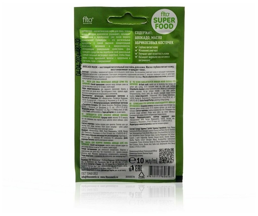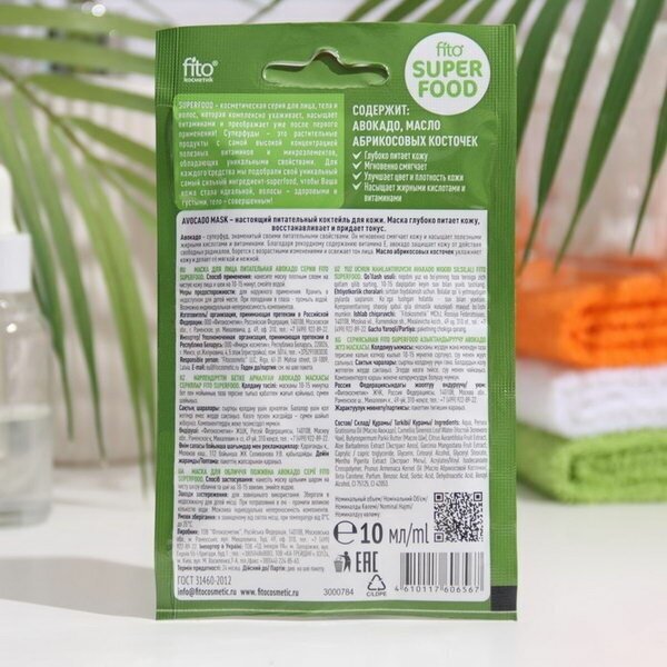 Маска для лица Fito Superfood Питательная Авокадо 10мл ФИТОКОСМЕТИК