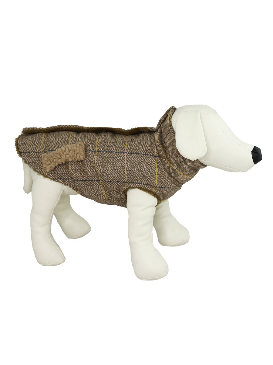 Теплая жилетка для животных в стиле модной клетки с подкладом из искусственного меха. С удлиненным воротником, защищающим от ветра. Крепления - кнопки. Обхват шеи - 28 см, обхват груди - 38 см, длина спинки - 25 см.