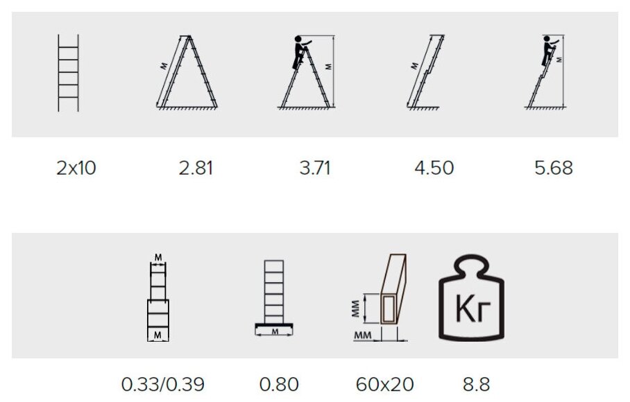 Может использоваться как раздвижная приставная лестница и как свободностоящая двухсторонняя стремянка. Необходимая длина конструкции в приставном виде обеспечивается перехлестом секций и фиксируются зацепом. От «расползания» лестницу в положении «двухсторонняя стремянка» удерживают страховочные ремни. Они же обеспечивают требуемый перехлест в положении «приставная лестница». Конструкция неразборная, поэтому отдельно пользоваться каждым из двух элементов лестницы невозможно. В верхней части лестницы расположен верхний соединительный узел. На широкой секции внизу имеется стабилизатор, который придает лестнице дополнительную устойчивость. Внизу на секциях установлены массивные обрезиненные башмаки. На ступенях имеется рифление.