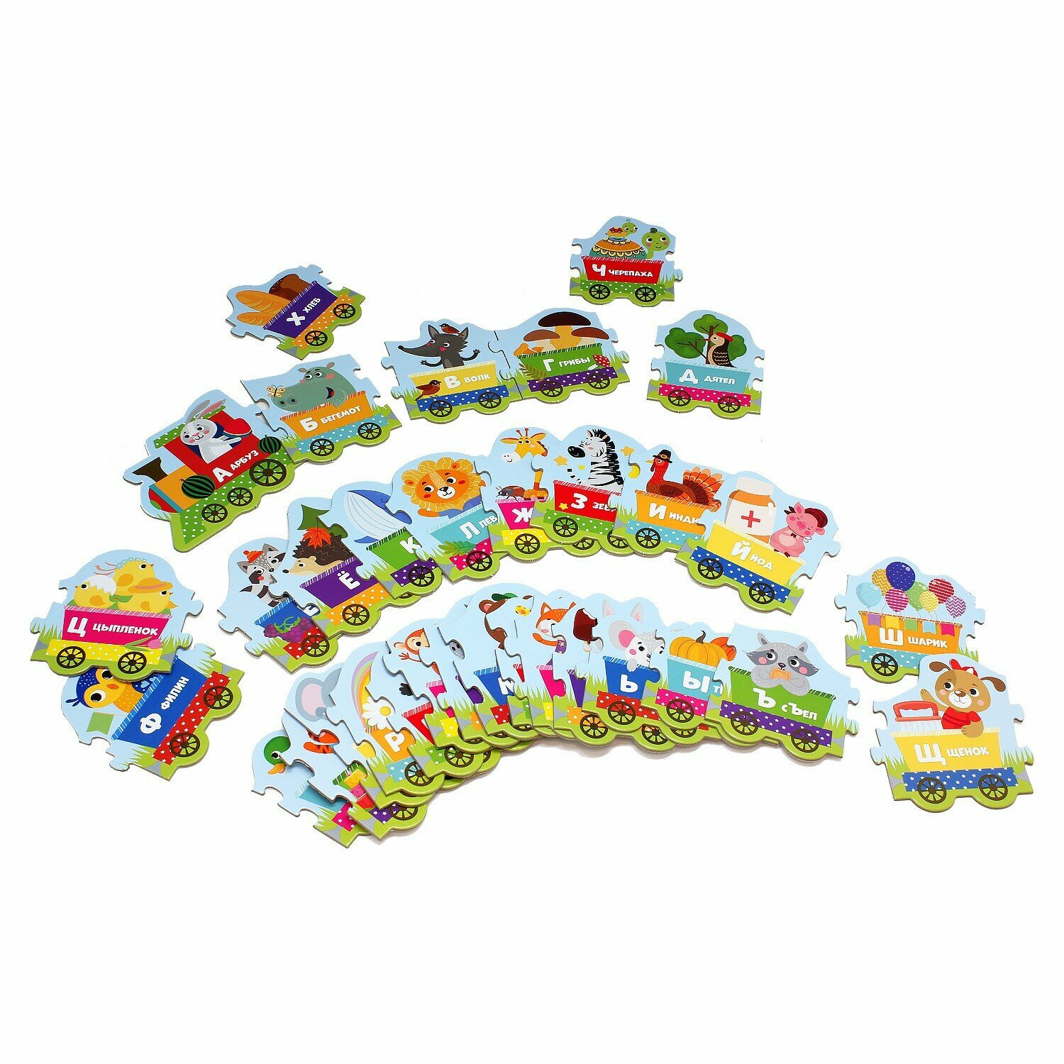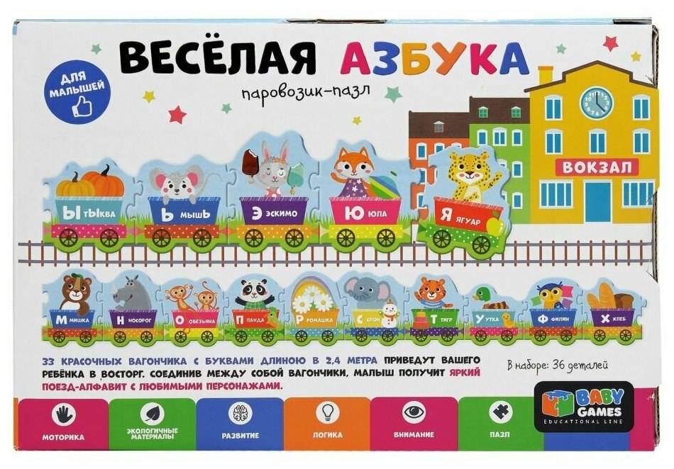 Обучающий набор "Паровозик: Веселая Азбука" поможет вашему ребенку легко выучить буквы алфавита. Соберите вагончики, состоящие из буквы и слов, начинающихся с этой буквы, а из вагончиков - разноцветный паровоз. Все элементы снабжены пазловыми замками, которые помогут правильно собрать паровозик.