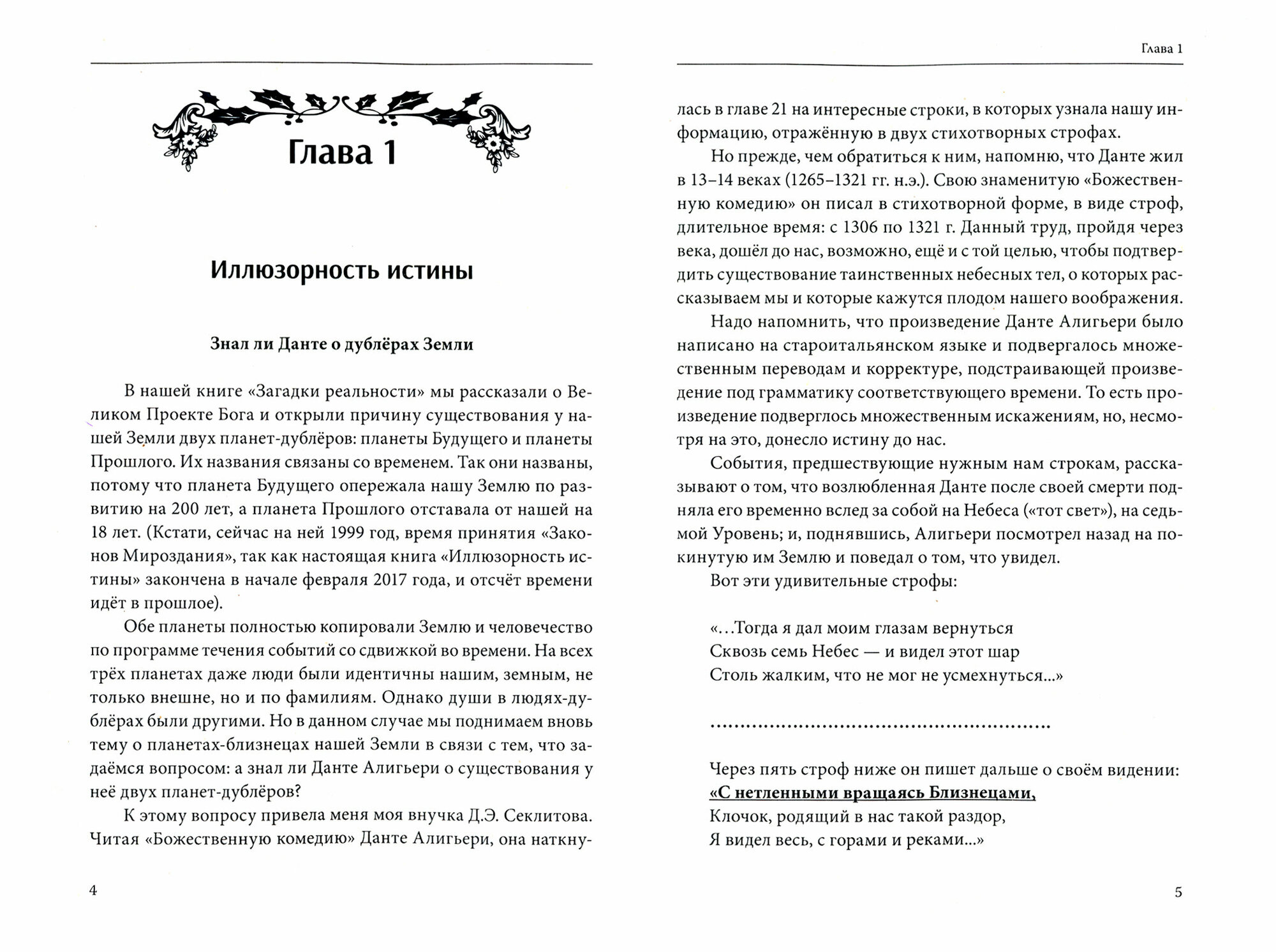 В данной книге читатель узнает, что рассказал Данте о дублёрах Земли, какую загадку таит начальная буква космического имени Иерарха Медсистемы. Ему откроется, что такое истина и как она способна меняться со временем, как ложь может превратиться в истину и наоборот. Книга расскажет о том, живут ли семьями на других планетах, для чего появилось суррогатное материнство, в чём особенности усыновления детей, как пересадка органов влияет на изменение характера и что будет при пересадке головы человека, а также об обретении вечности и результатах клонирования. Читатель узнает о карме сиамских близнецов и аутистов и о том, попадёт ли А.С. Пушкин в шестую расу, о возможностях контакта с артистом Олегом Далем.